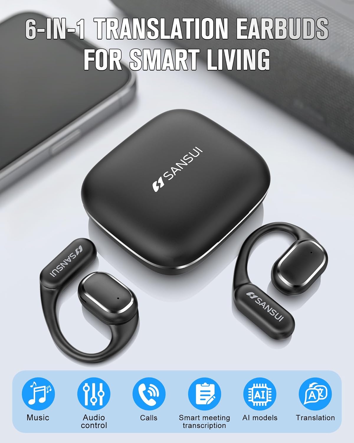 SANSUI New 6-in-1 Real-Time Translation Earbuds—Our translation earbuds provide offline translation, high-definition calls, sound equalization, smart meeting recording, 𝐃𝐞𝐞𝐩𝐬𝐞𝐞𝐤 AI, and immersive music playback. With advanced Bluetooth 6.0 technology, enjoy twice the speed of Bluetooth 5.4, 50% more coverage, 40% less power consumption, 8 times more device connections, and a 6dB boost in signal-to-noise ratio. These translate earbuds are perfect for professional settings as well as everyday use.