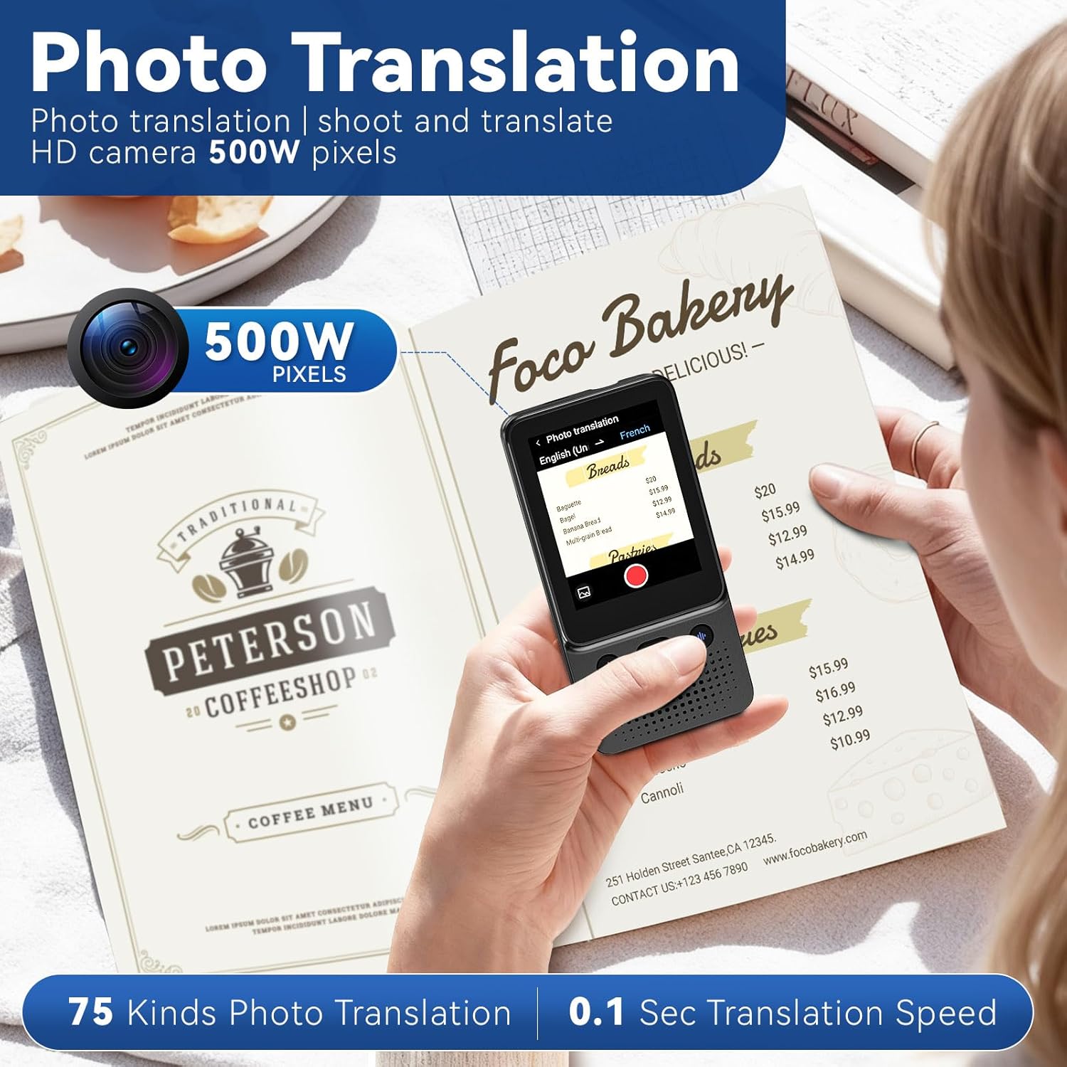 Support photo translation in up to 74 languages, making it easier for you to read menus/signposts/magazines/labels in different languages. Equipped with a flash design, it can be used normally in dark places, travel translator device no wifi needed