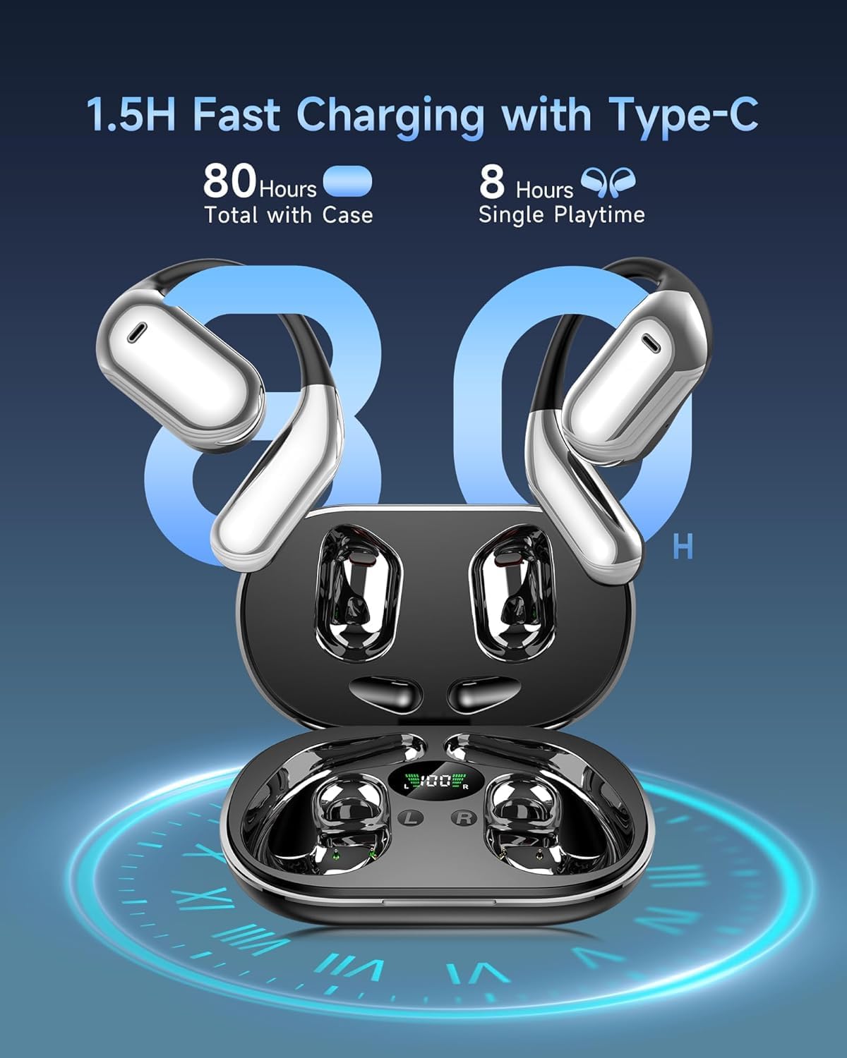 [Ultra Open-Ear Design for Comfortable Wear] – Made of high-quality and lightweight PC material, each earbud weighs only 8g and is IPX7 waterproof. The soft silicone ear hooks provide a secure and comfortable fit, making them ideal for sports, workouts, and daily activities. Enjoy music while staying aware of your surroundings with these versatile earbuds.