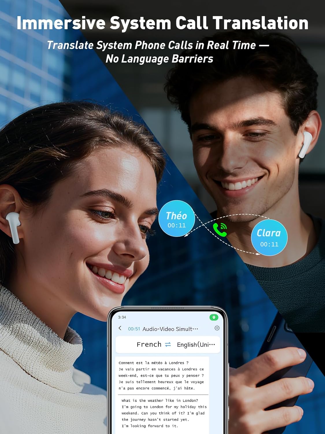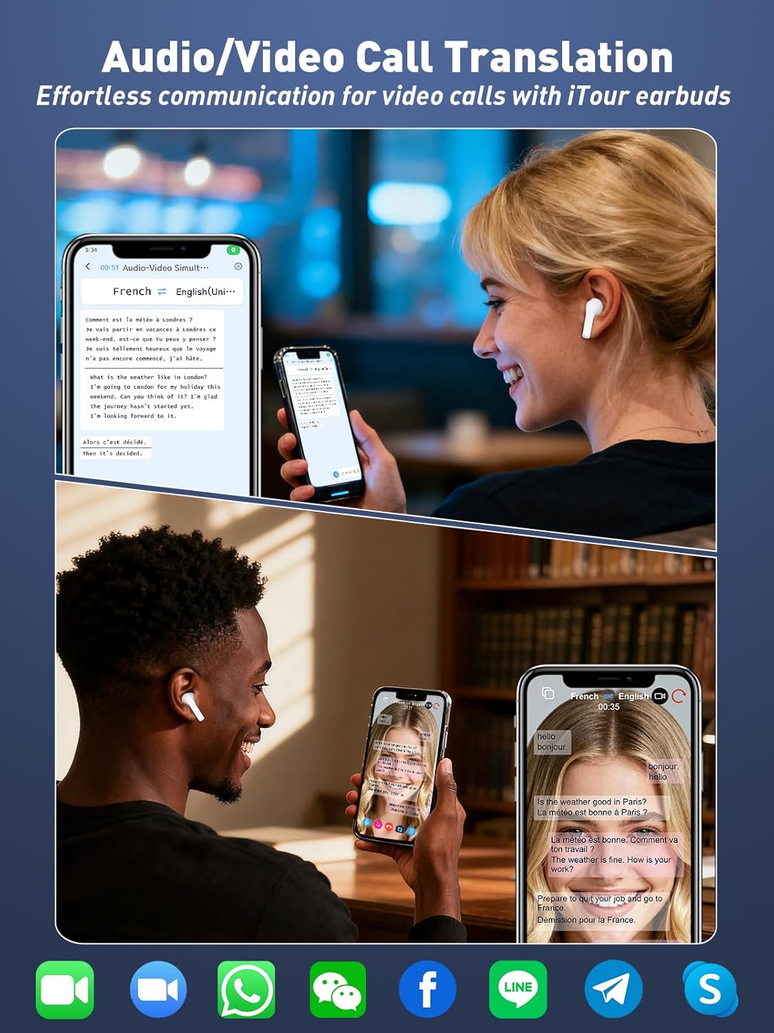 Unique Phone & Video Calls Translation: The 2025 iTour 22 PRO translation earbuds support direct real-time translation during phone calls. Just make or receive a regular call—our earbuds provide instant, two-way translation. The earphones also support voice and video call translation on WhatsApp, Facebook, Line, Telegram, WeChat, Skype, and more