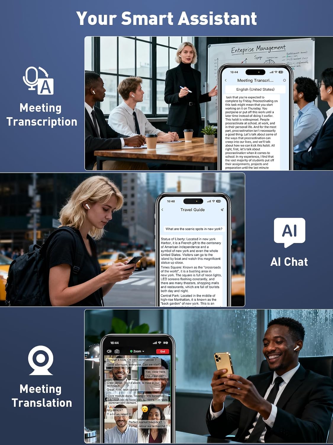 Bidirectional Simultaneous Translation: Download the “iTourBuds” app (no subscription needed—lifetime free), pair your language translator earbuds, and you’re ready to go. Enjoy lightning-fast 0.3-second two-way translation. Each person wears one 22 pro earbud and speaks naturally while the other hears the real-time translation. More than a translator earbuds—it’s your business assistant