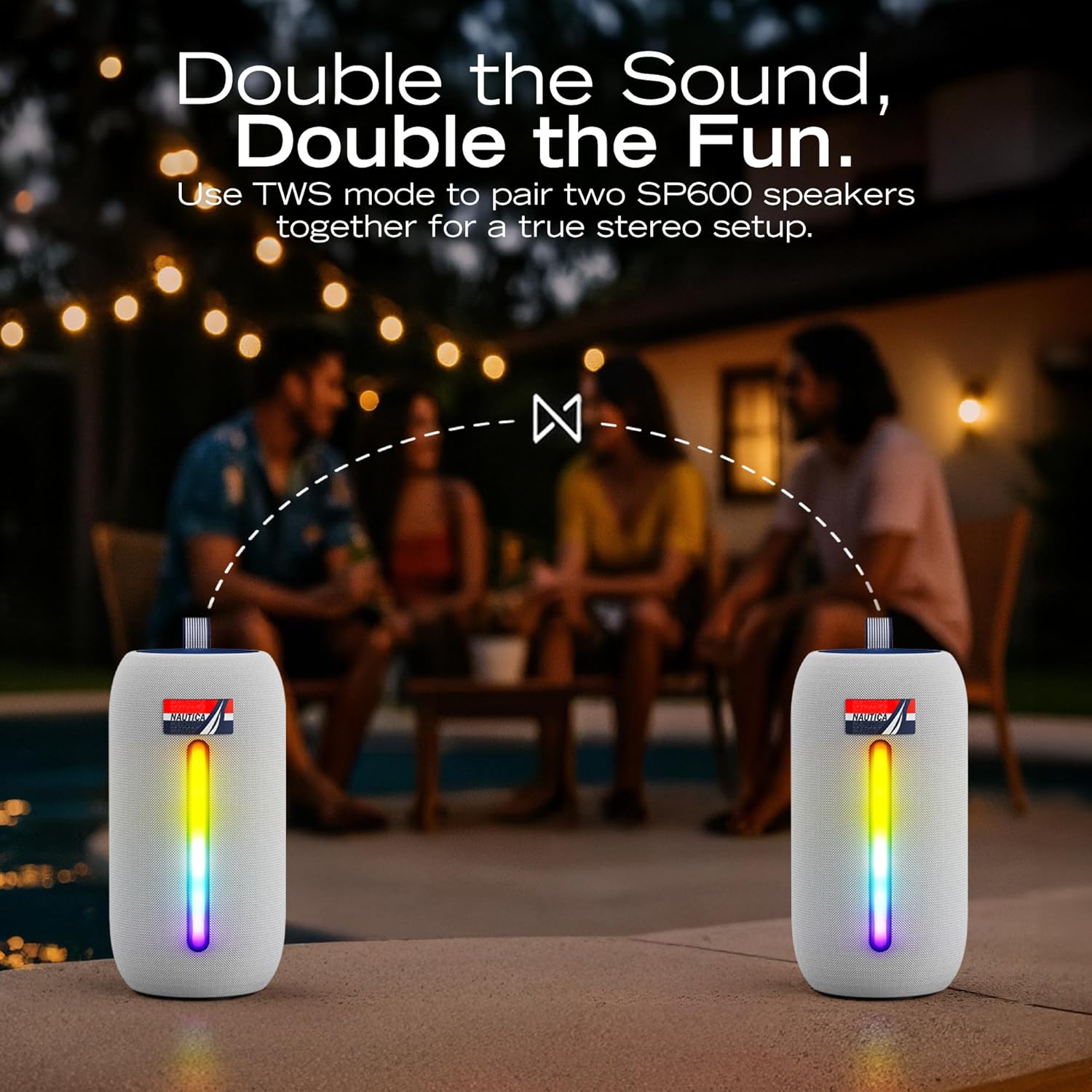 The Nautica SP600 Bluetooth Portable Speaker is here to bring the party wherever you go! With its stylish fabric cover and rubber soft-touch finish, this wireless speaker with Bluetooth functionality as durable as it is good-looking. Packed with 15W PMPO power, this travel speaker delivers clear highs and deep bass, filling any room or outdoor space with vibrant sound. Bluetooth 5.3 ensures easy and stable connectivity up to 10 meters, and with TWS, you can pair two SP600s for a total of 30W of stereo sound. Enjoy up to 8 hours of playtime, and control everything with the easy buttons or switch up the vibe with 5 ambient light modes. Need a quick connection? Use the USB, SD, or AUX inputs to keep the music going! Plus, with an IP5 splash-proof rating, you can take this outdoor Bluetooth speaker anywhere without worrying about the weather. Add this rechargeable speaker to your collection of travel accessories today, this cool gadget is the perfect camping companion, beach vacation essential, festival essential, and everyday music player.
