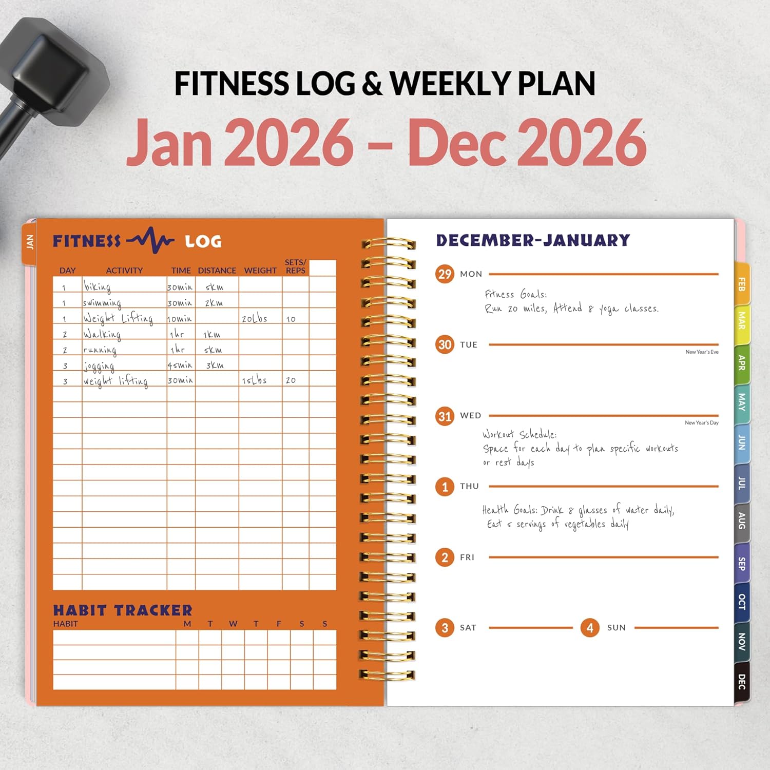 Fitness Log and Week Plan – 2026 Workout Planner stay organized and record your gym workouts with this comprehensive fitness planner. It provides 53-Fitness Log pages and 53-Week Plan pages dedicated to habit trackers and log exercises, sets, reps, weights, allowing you to monitor your progress over time.