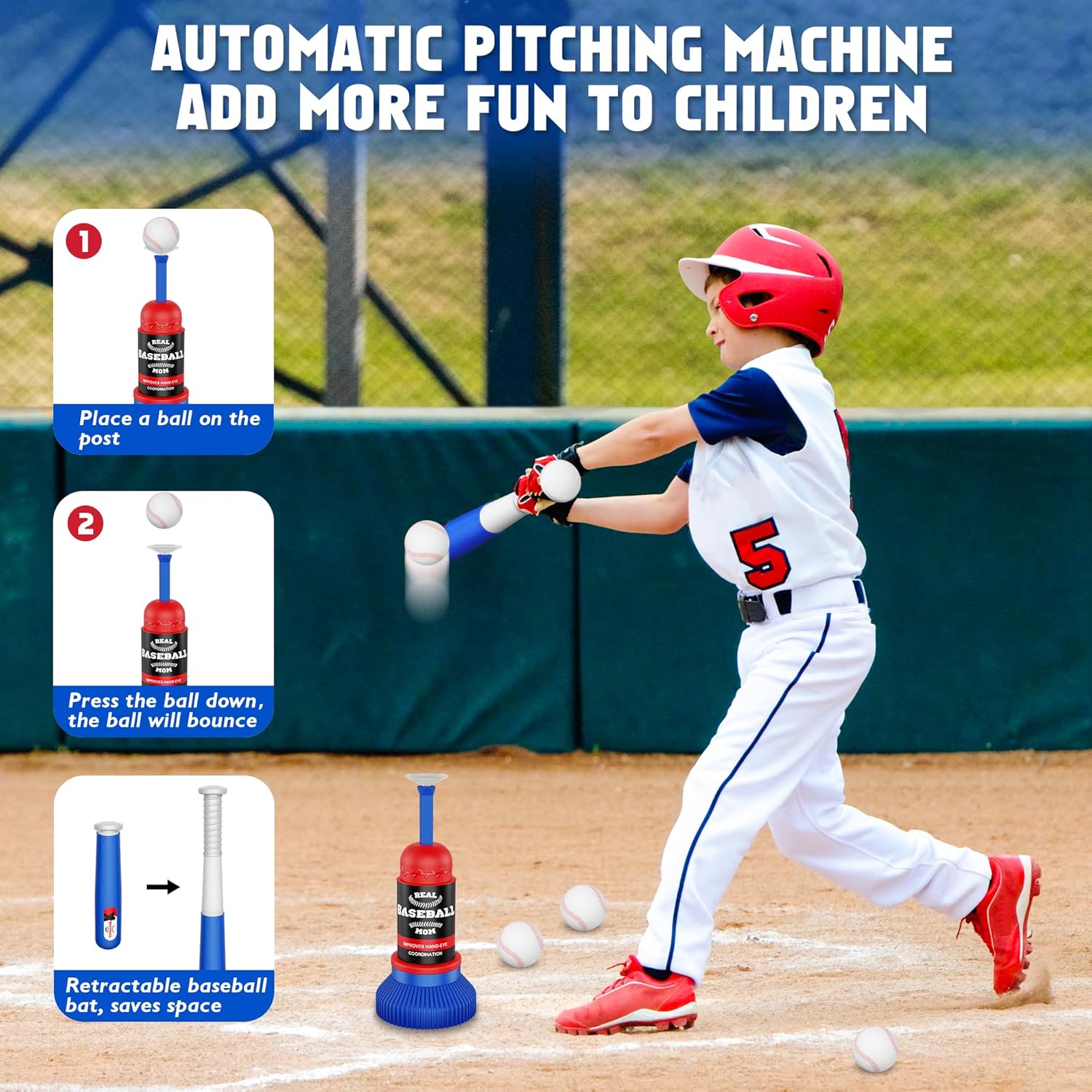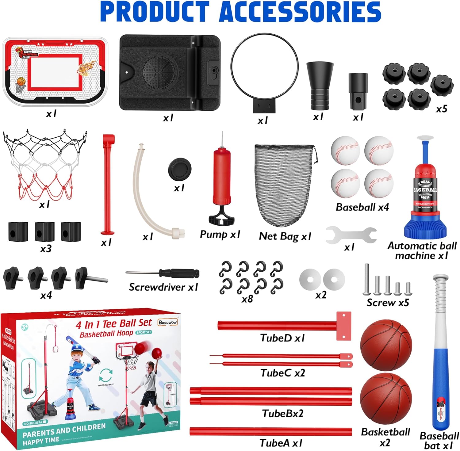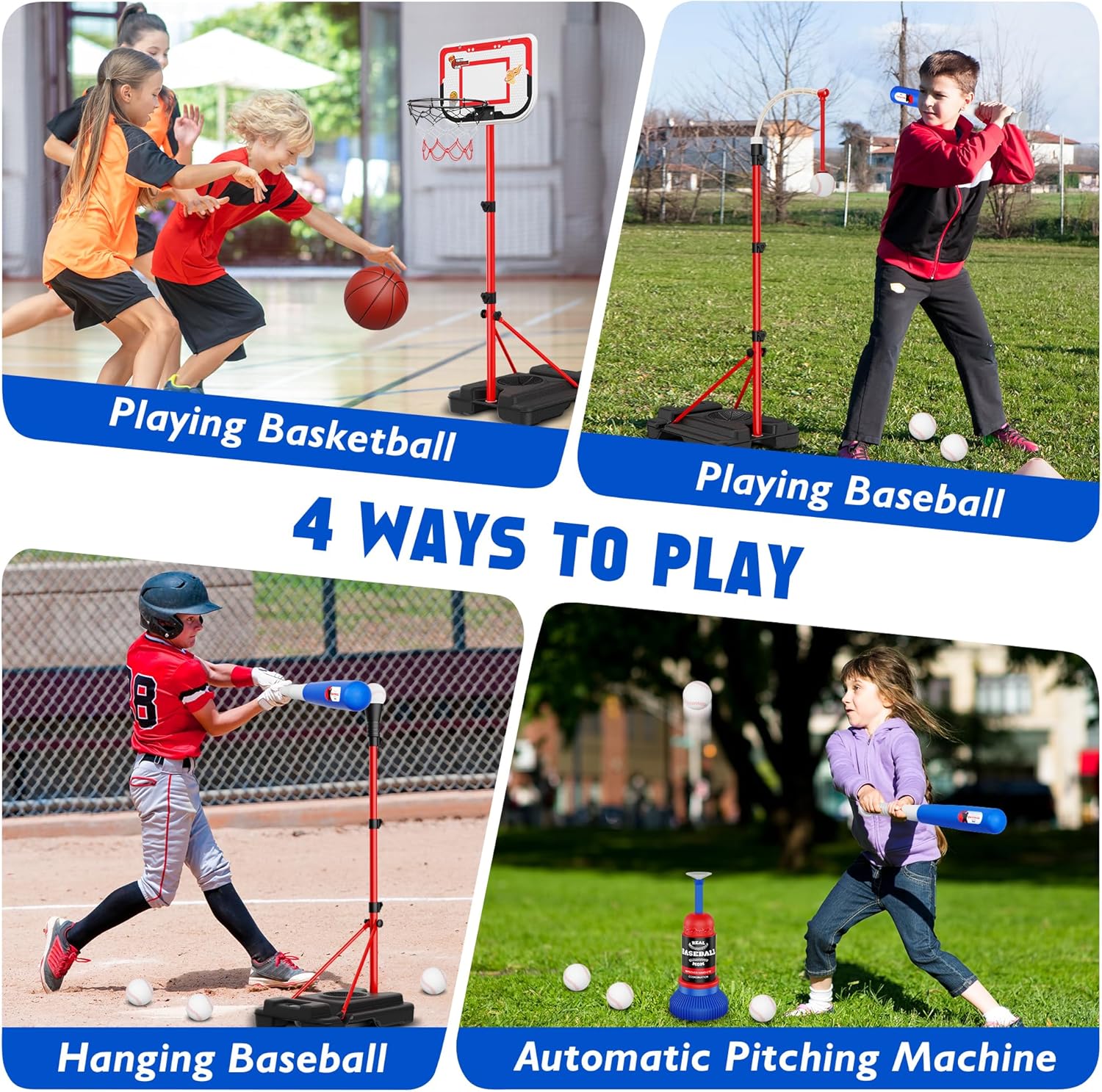 4 in 1 Versatile Sports Toys: 1. adjustable height basketball hoop: with 2 basketballs and 2 hooks, 2. automatic pitching machine: pop up the baseball that needs to be hit automatically, 3. hanging baseball hoop: experience a new way of hitting ball, great for beginners to practice, 4. T ball stand: with a baseball bat and 4 baseballs