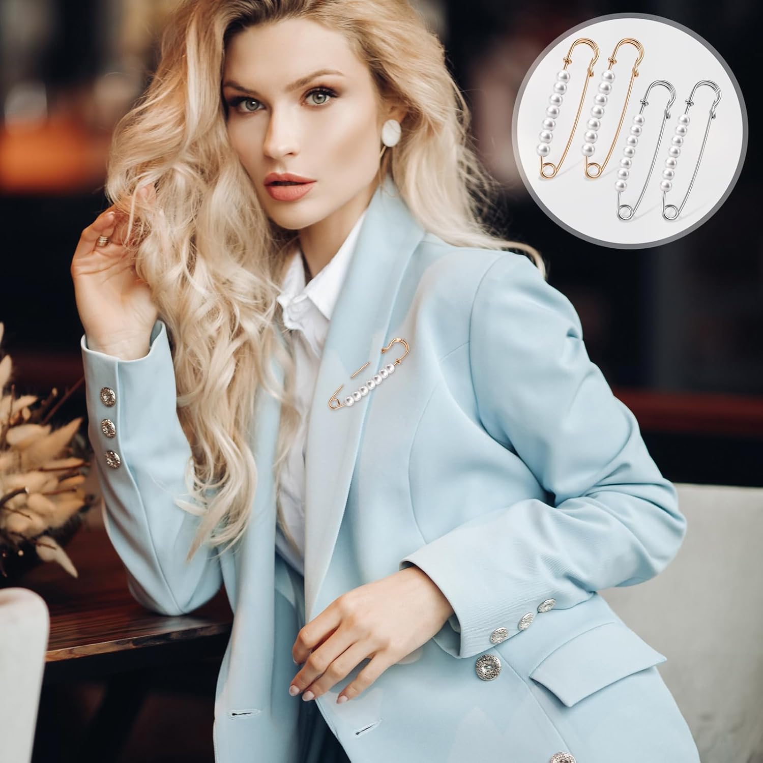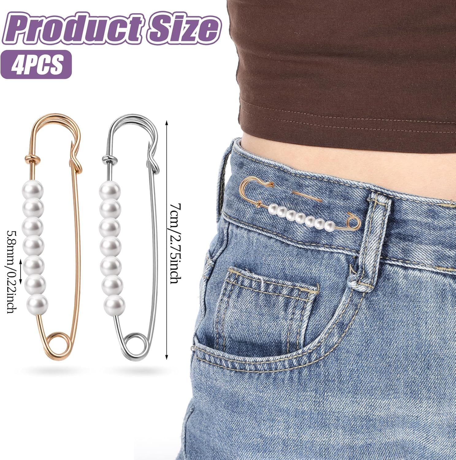 4 Pcs Faux Pearl Brooch Pins Decorative Safety Pins Pants Clips Tighten Waist Pins Large Shawl Pins for Women Clothing Dress Pants Skirt Dressing Accessories Waist Extender Decorative Pins