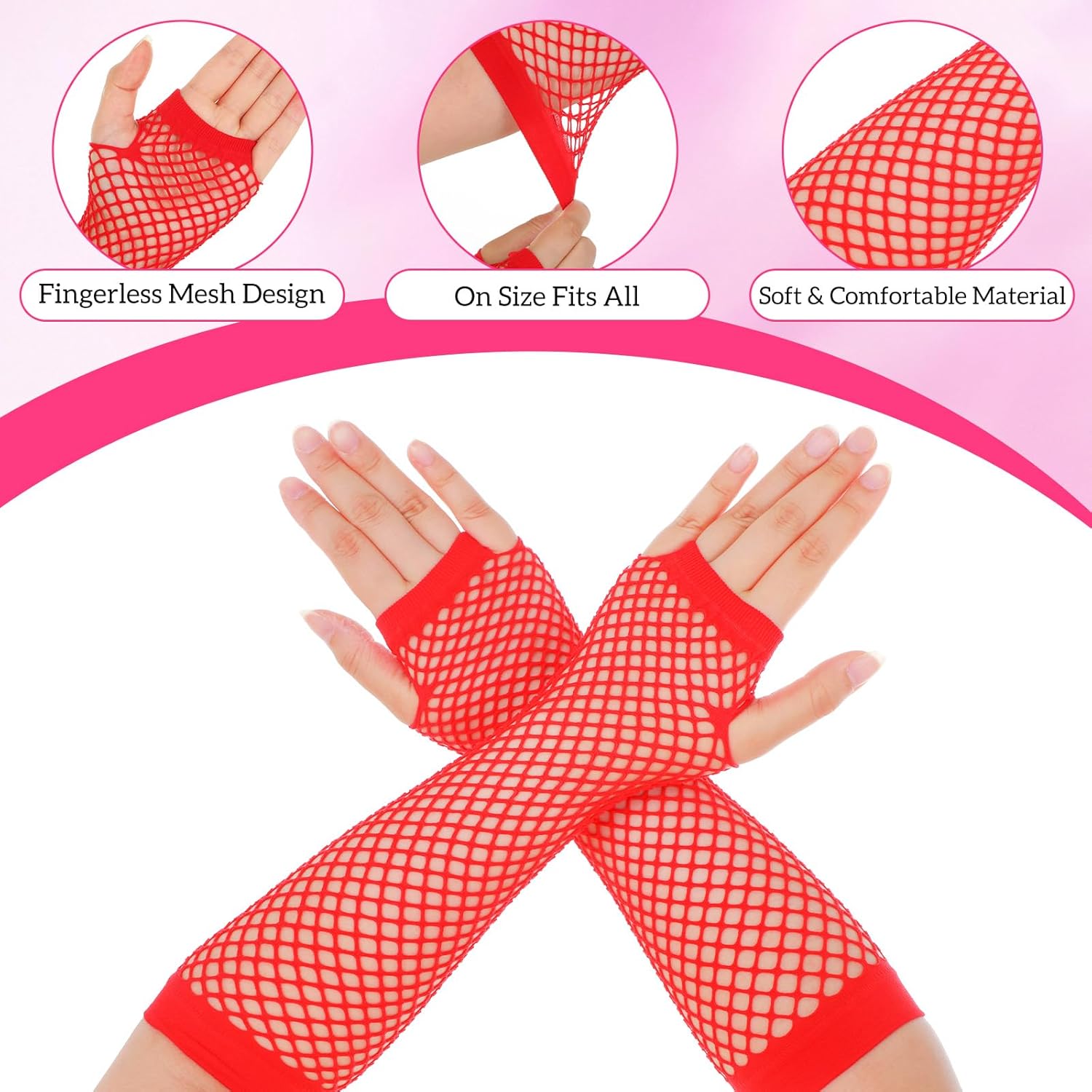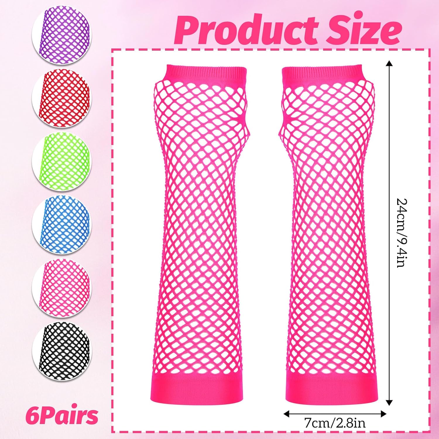 6 Pairs Fishnet Gloves Fingerless Neon Gloves, Long Fingerless Fishnet Arm Sleeves for Cosplay Halloween Party Scene Clothes for Women Men 80s Party Costume Accessories Supplies