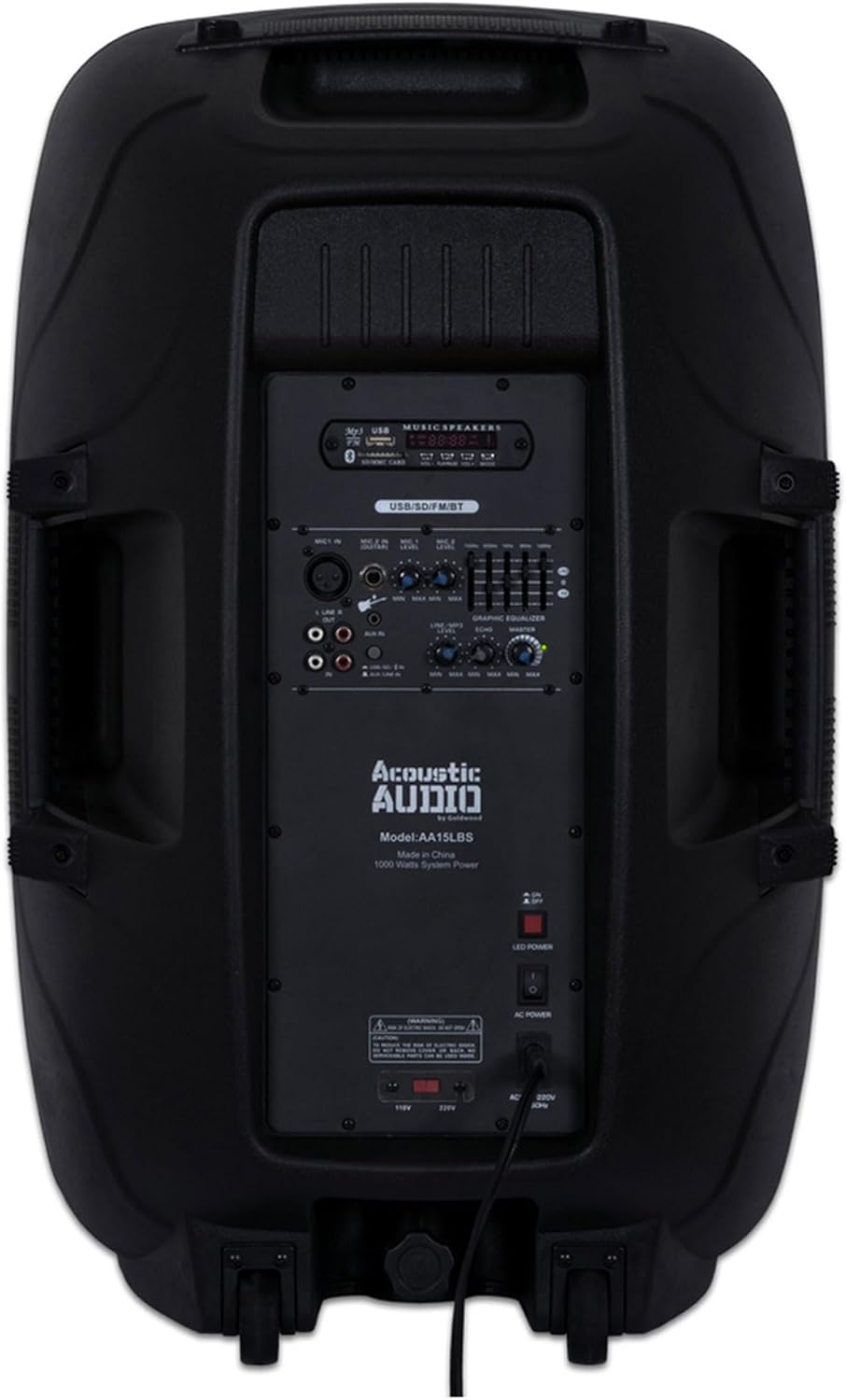 Take your home and outside events to the next level with the Acoustic Audio by Goldwood AA15LBS Powered 15″ Flashing LED 1000W Bluetooth Speaker Set. This high-performance Bluetooth speaker system delivers clear, powerful sound with its built-in 1000 watt amplifier, perfect for ultimate entertainment at parties, DJ sets, karaoke, and live performances. Whether indoors or outdoors, this speaker box ensures you’re heard with dynamic clarity across any venue, making it a must-have for your house. Enhance your experience with the vibrant multi-colored LED light display of this karaoke speaker that syncs to your music, creating a dazzling show. The lights in this microphone and speaker set can be switched off for more formal events, offering versatility in any setting. Seamlessly stream music in this home speaker system via Bluetooth, or use the FM tuner, USB drive, SD card slot, and multiple input options like RCA, 1/4 inch mic, instrument, and AUX inputs. Control your audio in this DJ speakers set with the five-band graphic equalizer and volume knobs for mics, echo, and master control, allowing you to customize your sound. Plus, the RCA line level output of this Bluetooth speaker with lights lets you link another powered speaker for an even bigger sound. Built for portability, the AA15LBS speaker with aux input features rear wheels, handles, and an adjustable stand for easy transport. Whether it’s a tailgate, beach party, or garage jam session, this sturdy sound system goes wherever you need it. This all-in-one Bluetooth sound system comes ready to go with a powered rugged Bluetooth speaker, stand, wired microphone, and remote, ensuring you have everything you need for any event.