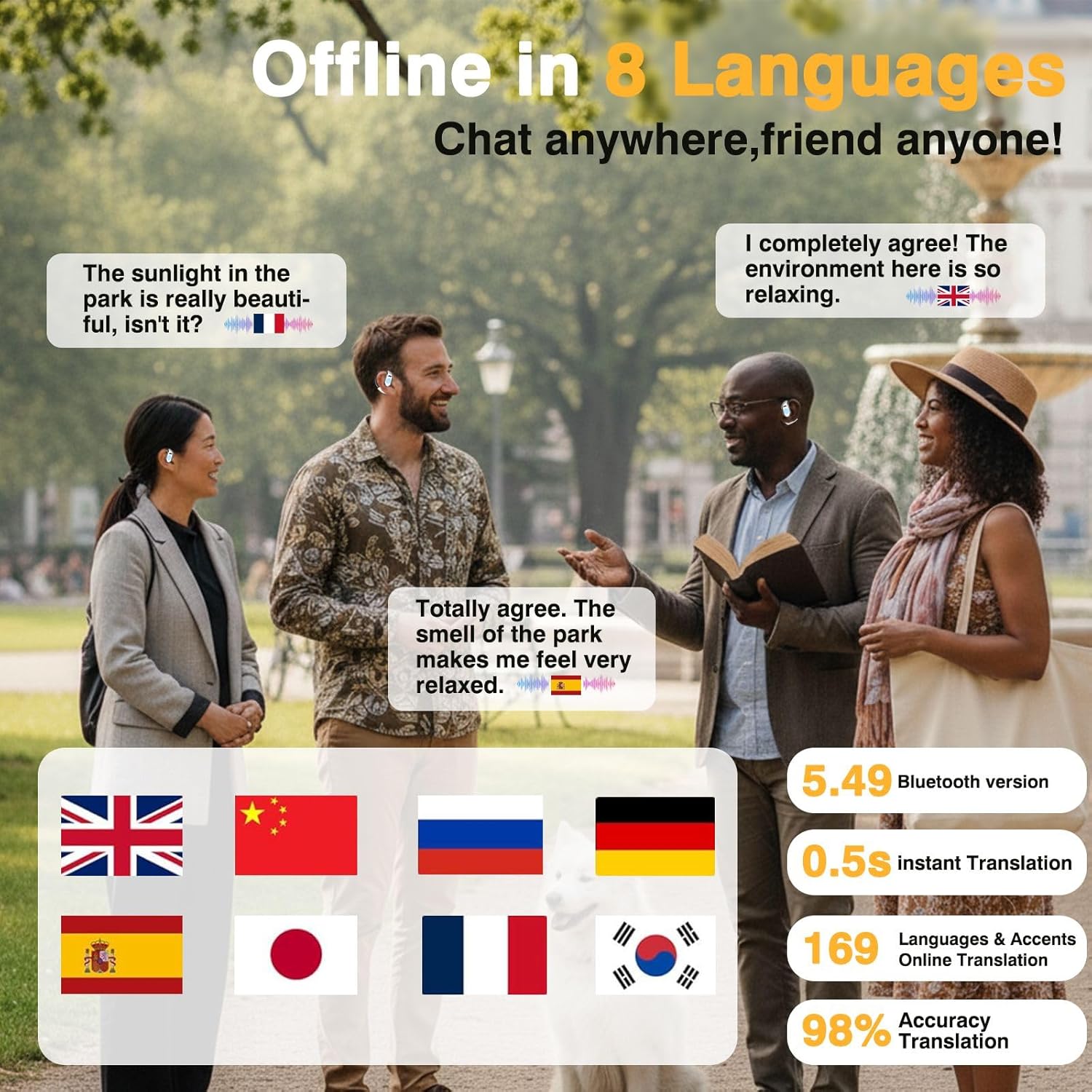 Multi-language translation: High-precision 144-language translator earbuds, real-time two-way translation and certain off-line package requires in-app purchase including Chinese, English, Japanese, Korean, Russian, German, French and Spanish
