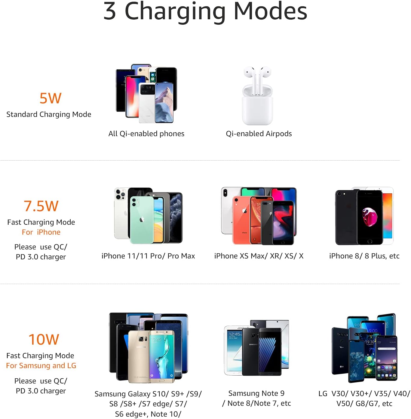 Use Quick charger 3.0 / PD 3.0 adapter (at least 9V/2A) for 10W and 7.5W charging for iPhones. A standard charger (5V/2A) allows 5W output. Charge vertically for messaging and easy facial recognition or horizontally for watching videos