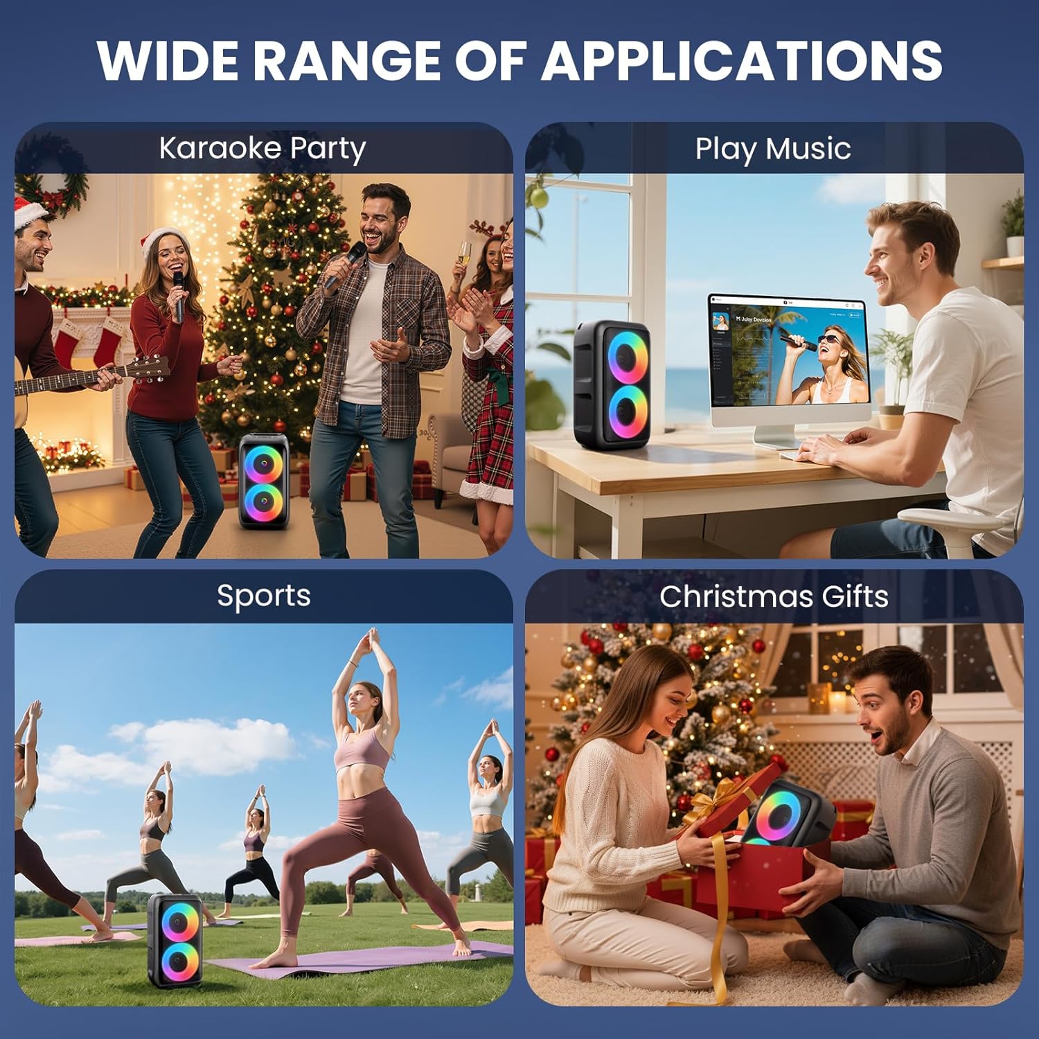 【Multifunctional Party Speaker】This bluetooth speaker can play music,karaoke, and amplify.We send two rechargeable wireless microphones,bluetooth speaker with microphone let us singing anytime, anywhere. Advanced Bluetooth 5.3 ensures broad compatibility with computers, tablets, phones, TVs, and more. It also supports AUX input, TF cards, USB drives, wired microphones, and instruments (via 6.35mm jack). The speaker’s top design allows for portability and supports holding your phone, tablet, or other devices. This is your ideal home party speaker.Note: The tablet above the party speaker is not included in the package.