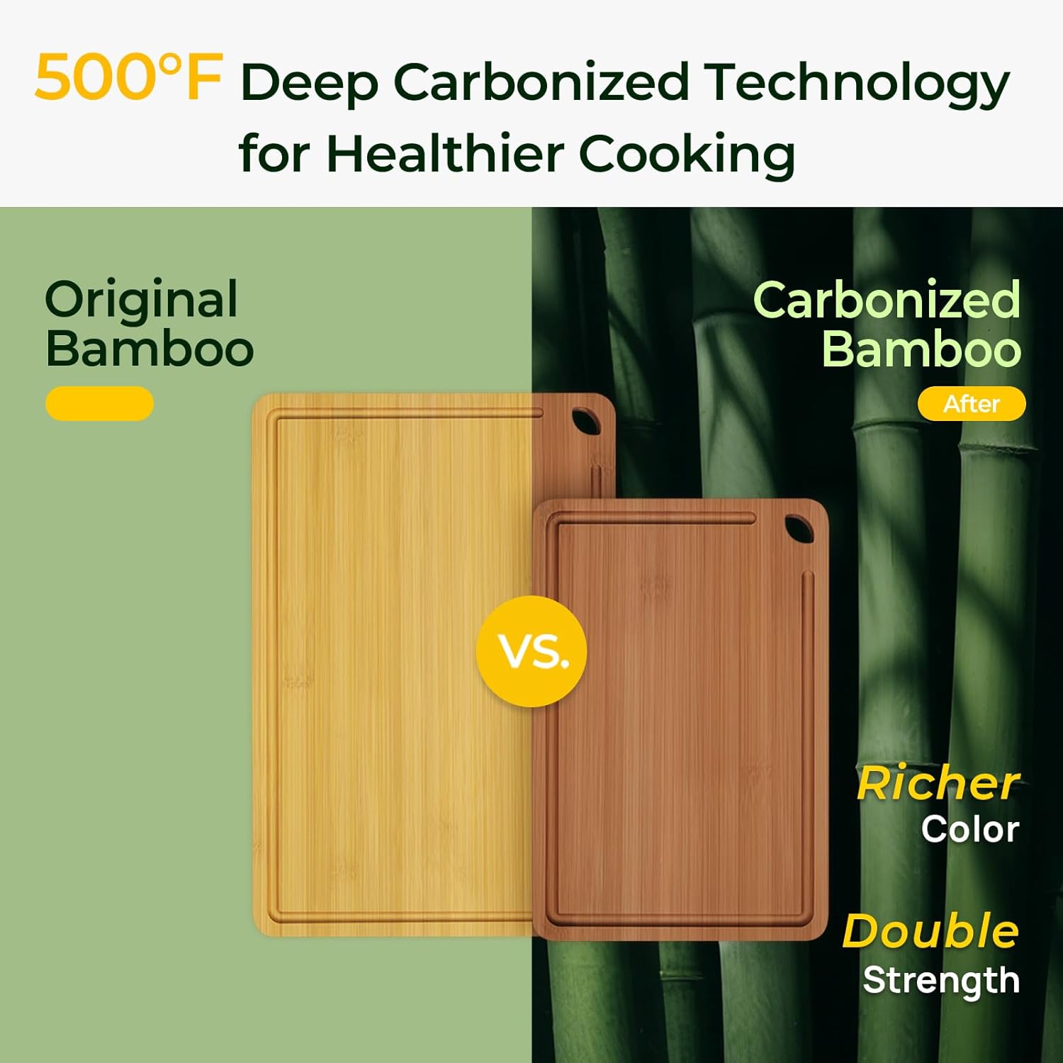 𝐔𝐏𝐆𝐑𝐀𝐃𝐄 𝐁𝐀𝐌𝐁𝐎𝐎 𝐂𝐔𝐓𝐓𝐈𝐍𝐆 𝐁𝐎𝐀𝐑𝐃𝐒 – Our cutting boards undergo a thermal treatment at 500°F (260°C), a process known as carbonization. This treatment enhances the bamboo’s stability, significantly reduces moisture absorption, and gives the board a rich, dark hue that complements any kitchen décor.