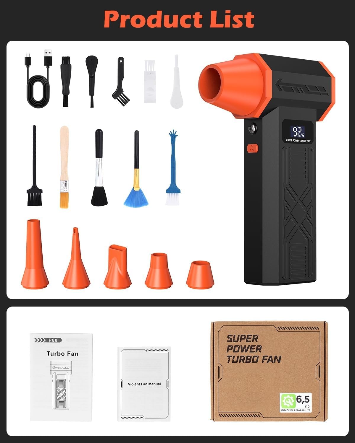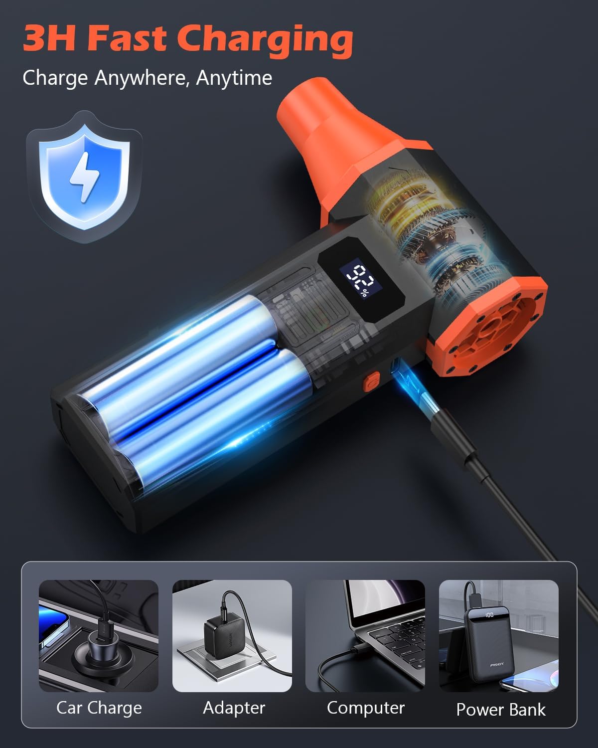 Long-Lasting Battery & Power Display: This compressed air duster equipped with 2x 2600mAh rechargeable batteries, delivering up to 240 minutes of runtime on the lowest setting and charging fully in just 3 hours. A clear HD display shows real-time battery life, reminding you to recharge promptly
