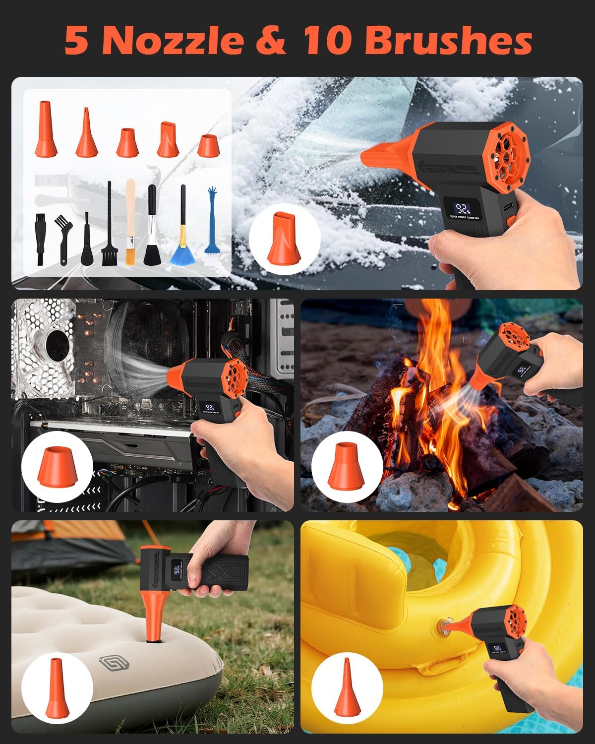 Multi-Tool Set & Wide Application: Featuring 5 different nozzle sizes and 10 assorted brushes, it delivers comprehensive cleaning capabilities, specifically designed for electronics, cars, leaves, snow, household items and hard-to-reach areas