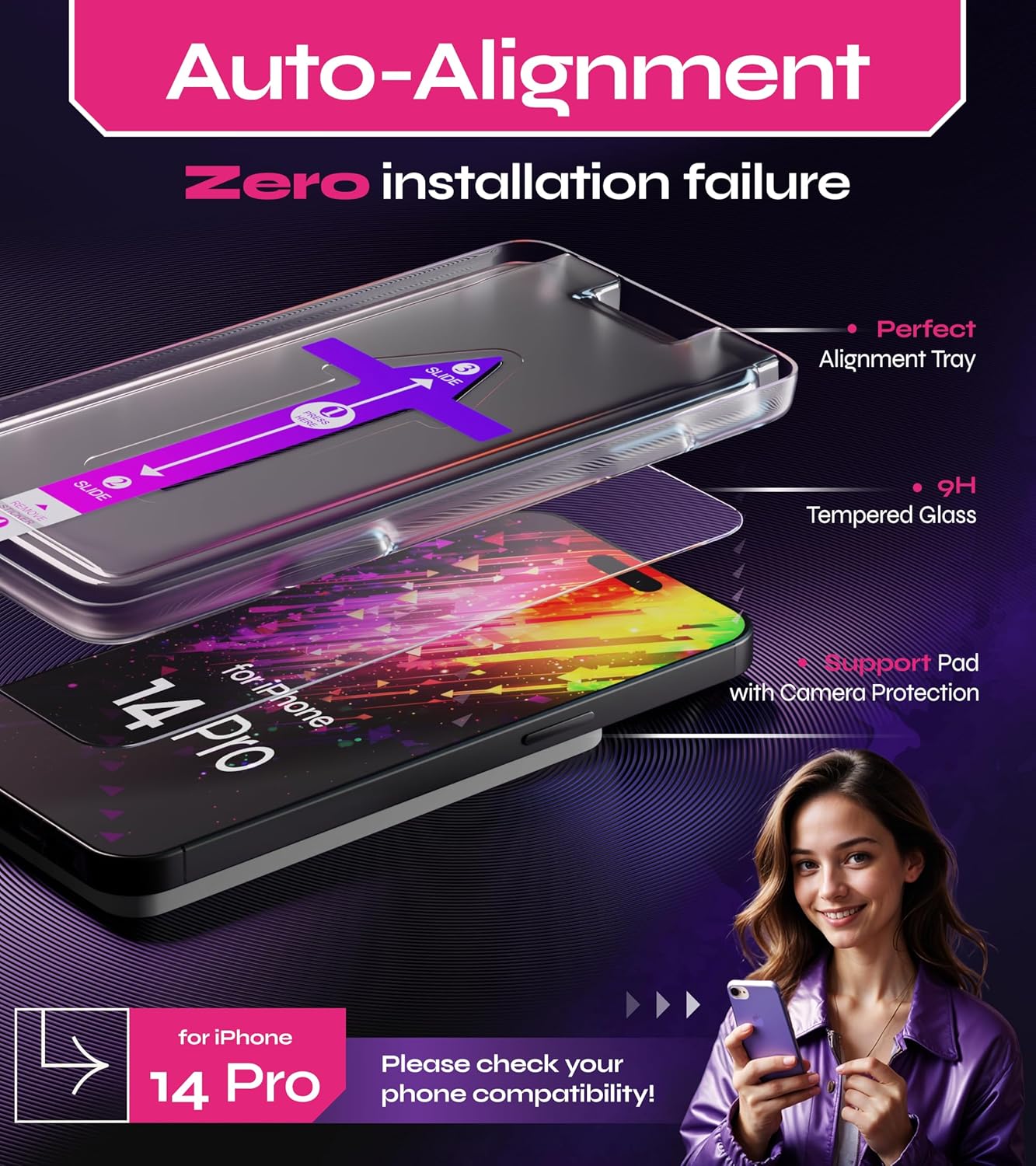 9H Nearly Diamond-Like Hardness Screen Protector for iPhone 14 Pro to Completely avoid Shattering, Cracking and Scratches. The High-Quality Oleophobic Coating keeps your Screen Fingerprint-Free, Air Bubble-Free and Dust-Free