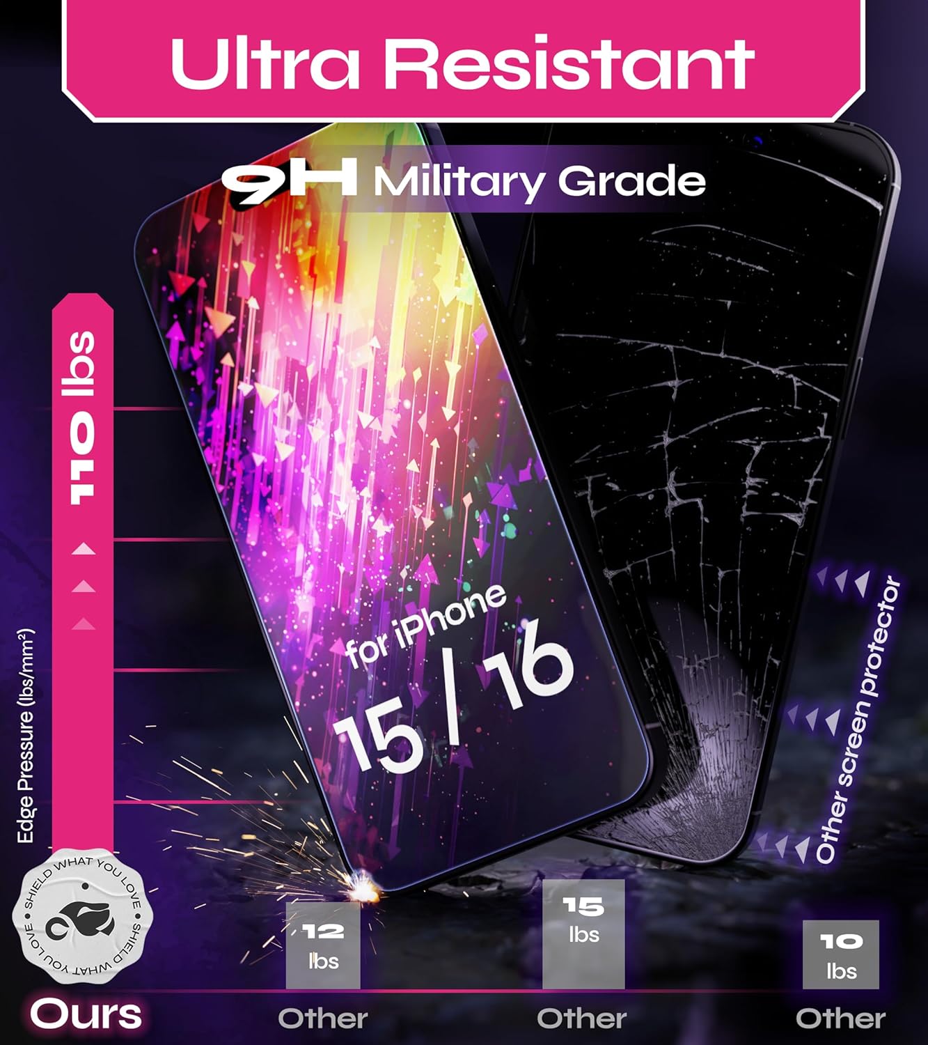 Ultra Resistant: Military-Grade Tempered Glass offers unmatched Shatterproof and Scratch-Resistant Performance; ideal for iPhone Screen Protector 15 / 16 and Tempered Glass for your iPhone 15 / 16 for Ultimate Protection