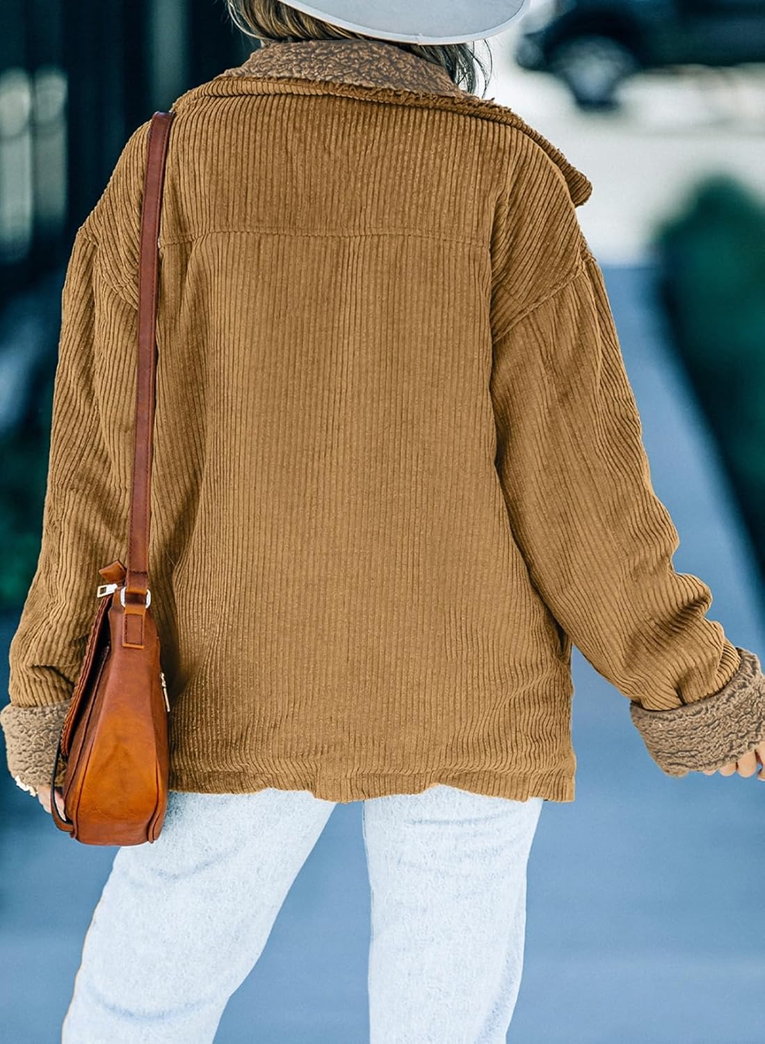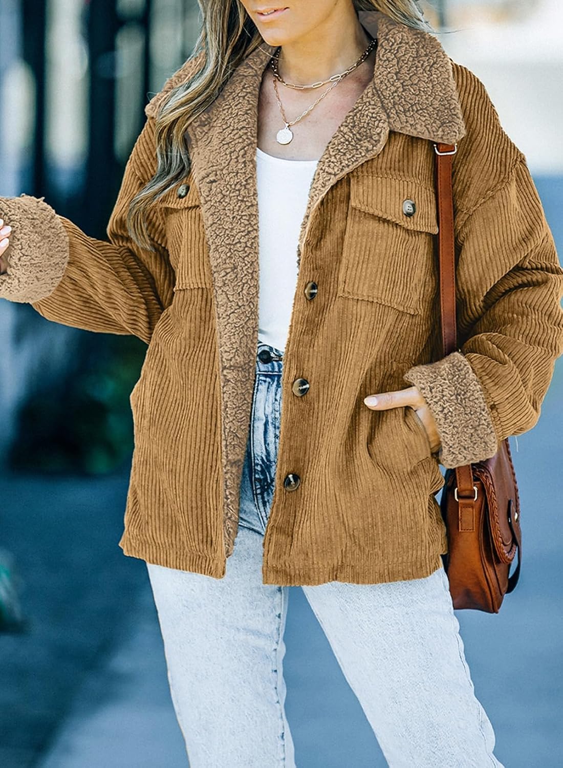 Dokotoo Corduroy Sherpa Jacket for Women Button Down Fleece Fur Collar Winter Warm Coat