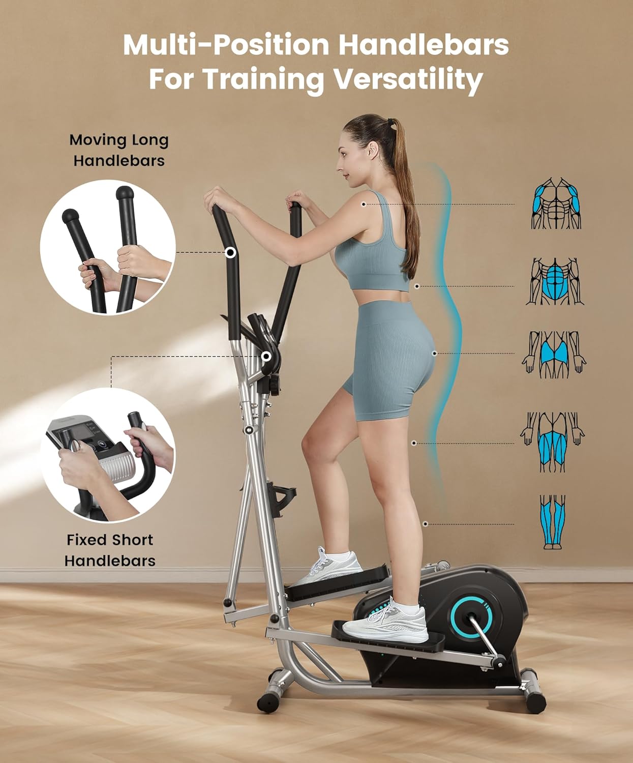 【Dual Handlebar Design】This elliptical machine features a dual handlebar design. Fixed Short Handlebars: Stabilize your core, focusing effort on lower body (glutes, legs) and core muscles. Ideal for beginners or those building core strength, reducing injury risk. Moving Long Handlebars: Engage upper body muscles while enhancing torso stability, boosting calorie burn. Perfect for intermediate users; increase resistance or adjust posture to build upper body strength and overall coordination