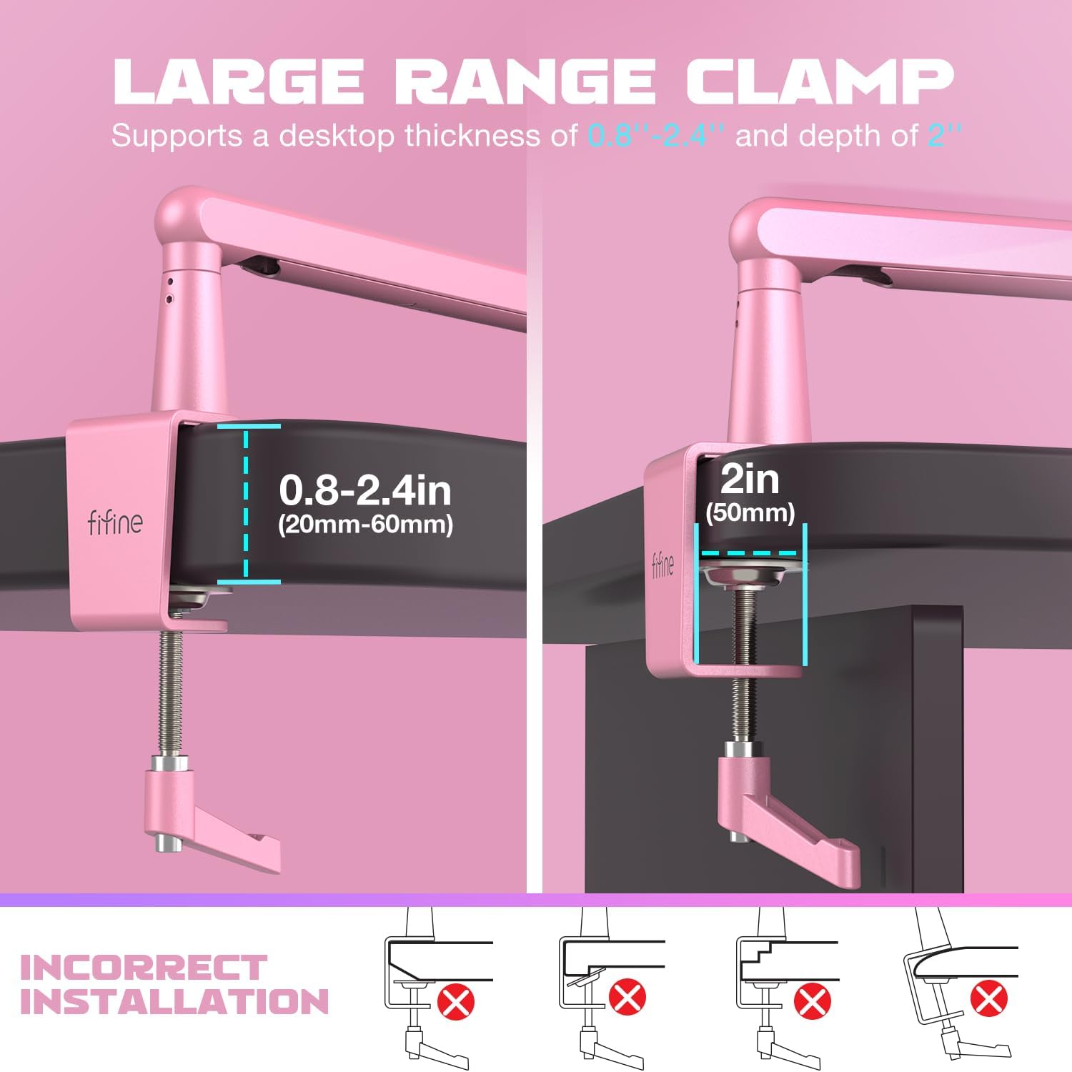 FIFINE Low Profile Boom Arm Mic Stand, Microphone Stand with Cable Management Channel, Desk Clamp, Screw Adapter for Streaming Podcast Recording, Adjustable Metal Mic Boom Arm Pink-BM88P