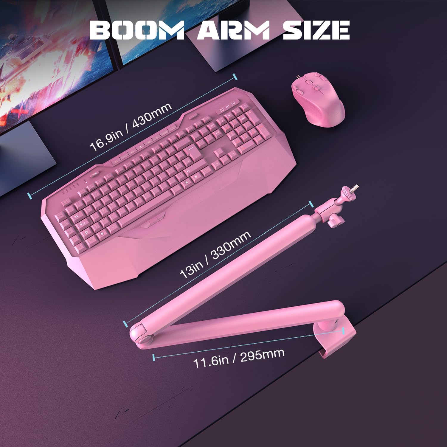 [Low Profile Design] The low-profile design of mic stand stays out of your way, giving you more space on your desk. The mic stand allows you to have your mouse under it or computer screen over it without blocking. The microphone boom arm stand will improves your desk setup and integrate into your pink theme.