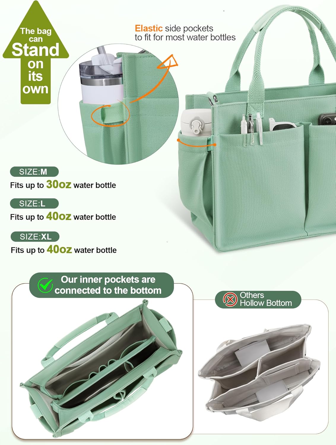 Customers find this tote bag to be of good quality and appreciate its size, noting it fits everything perfectly in its own spot. They praise its storage capacity with lots of compartments and side pockets for drinks, and find it practical for various uses, with one mentioning it’s great for airplane travel. Customers describe the bag as durable, good-looking, and love its color, while also considering it a great value for money.