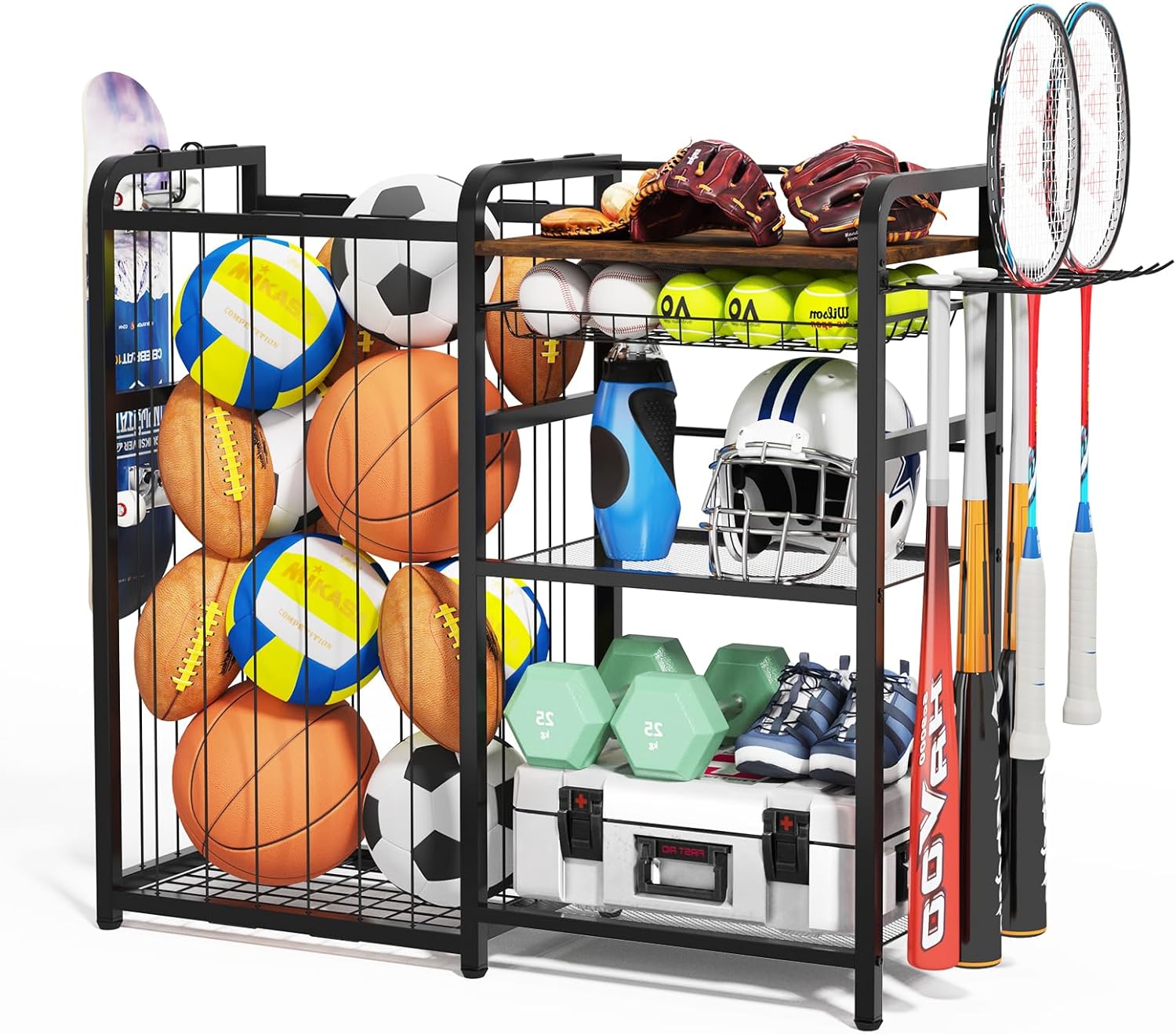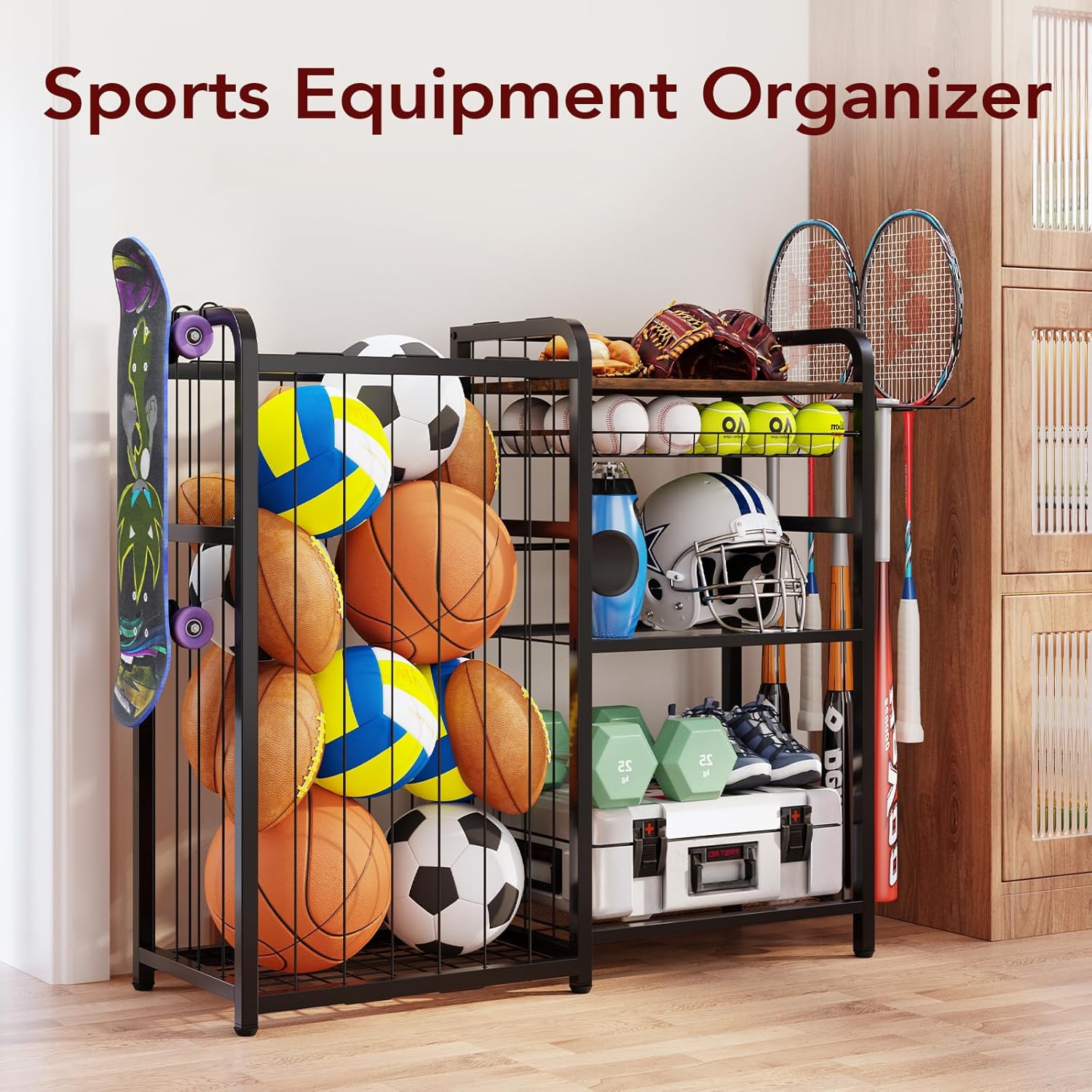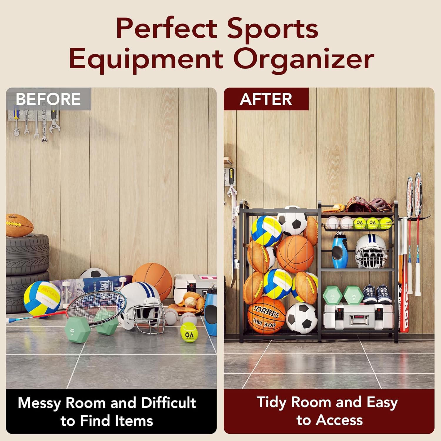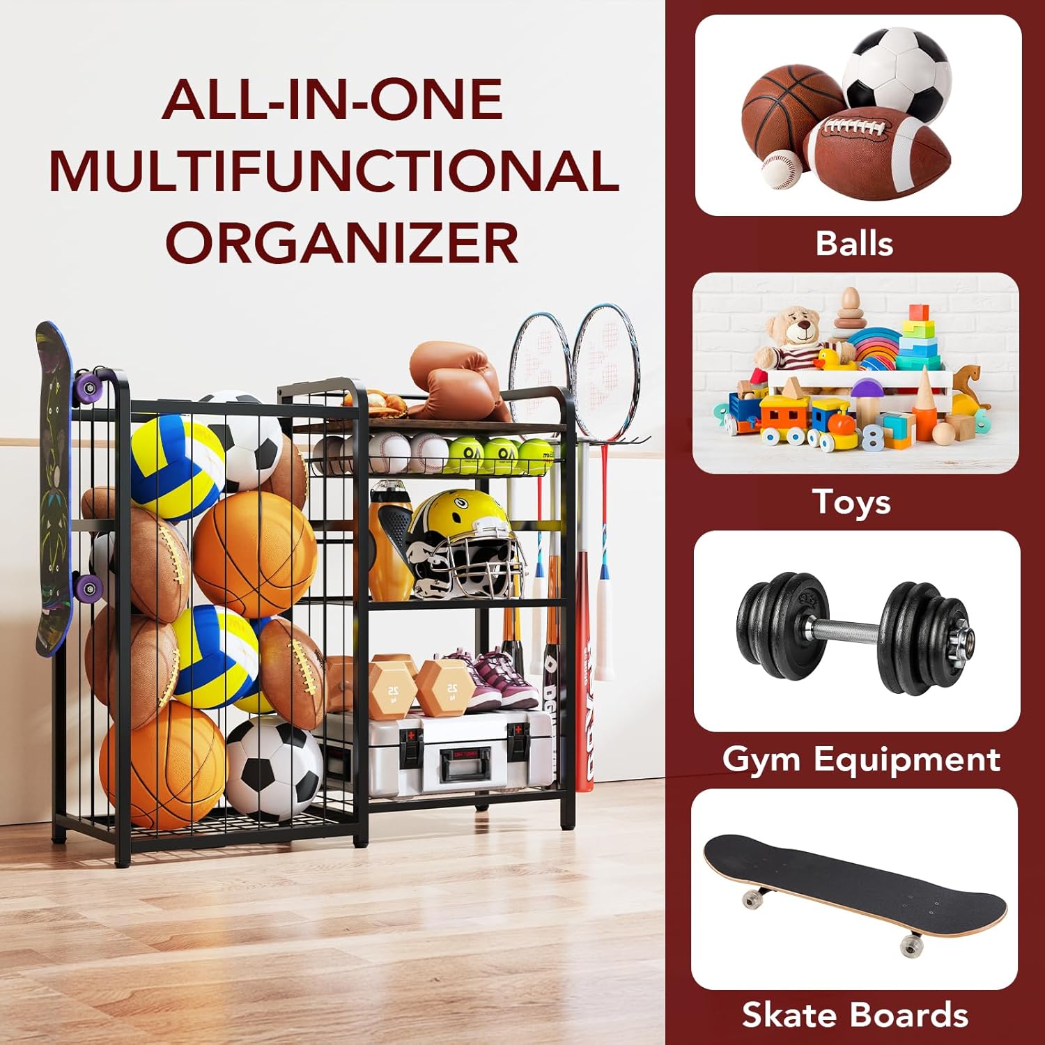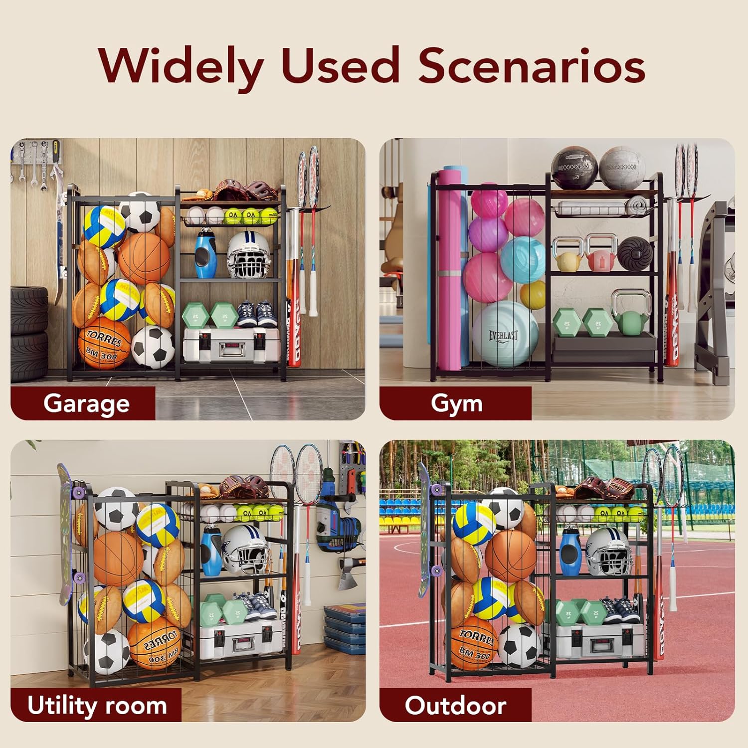 [Great Solution for Garage Ball Storage] Effortlessly organize your sports equipment with this sleek black ball storage rack. Designed to hold a variety of sports balls, including basketballs and stuffed animal storage, soccer balls, footballs, volleyballs, and more, it’s the perfect addition to your garage, home, or kids’ room.