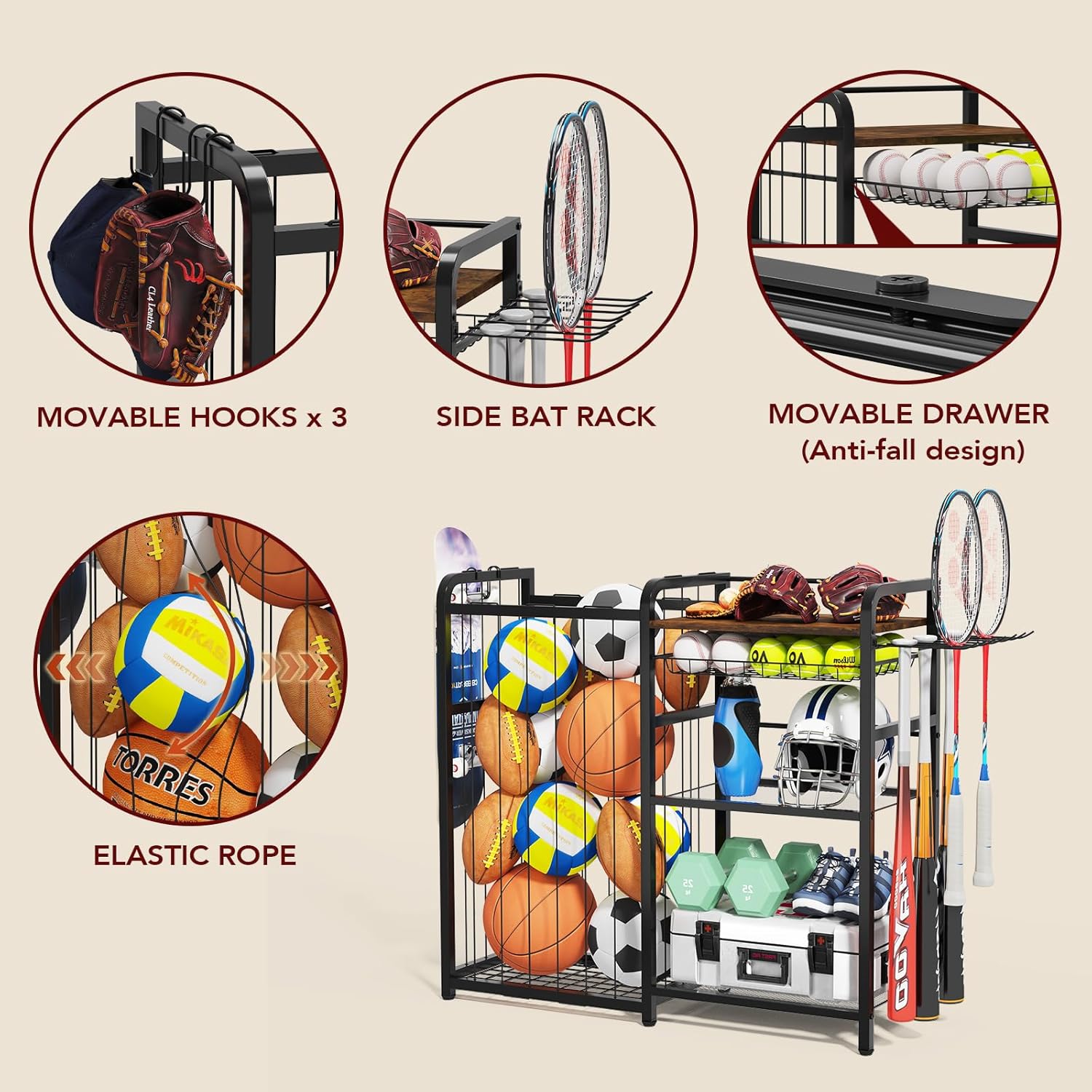 [Pull-out metal basket for Small Items] Our garage sports equipment organizer comes with a Pull-out metal basket at the top, ideal for storing smaller balls like tennis balls, baseballs, ping pong balls, and badminton shuttlecocks. The storage basket is also great for organizing small items like baseball gloves or children’s toys, making it easy to manage clutter anywhere you need.