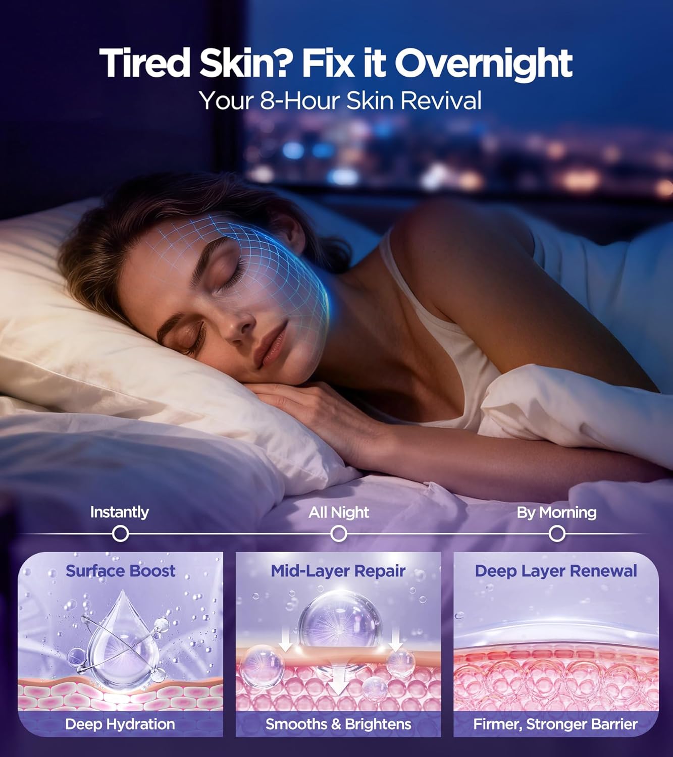 Sleep Your Way to Double Skin Repair: Want a real beauty sleep? While you snooze, this hydrating face mask works its magic—plumping, smoothing, and hydrating every inch of your face. Packed with 10% hydrolyzed collagen, trehalose, and squalane, it keeps skin soft and plump all night. Peptides and retinol smooth lines and boost elasticity while you catch Z’s. Super-light, fast-absorbing, never greasy, it drenches skin in breathable hydration so you wake up bouncy and glowing. Paired with our mud mask, this 2-step routine delivers maximum results—deeply cleansed, hydrated, resilient skin daily.