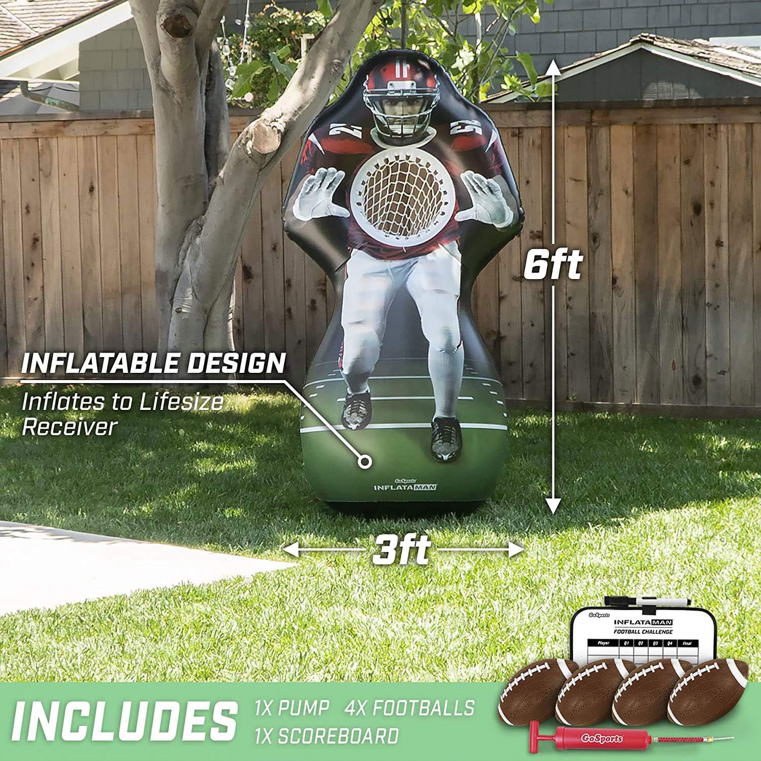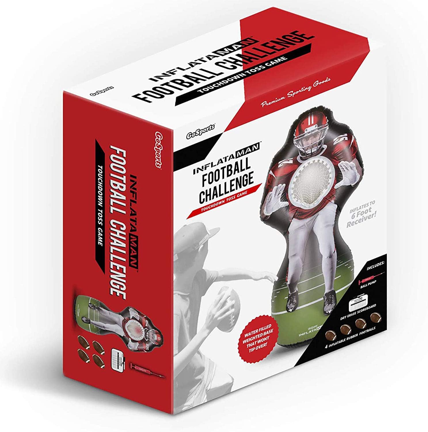 FOOTBALL INFLATAMAN: Step up to the ultimate endzone showdown; Full game set includes 1 Inflataman football receiver, 4 inflatable rubber footballs, premium ball pump and dry-erase scoreboard