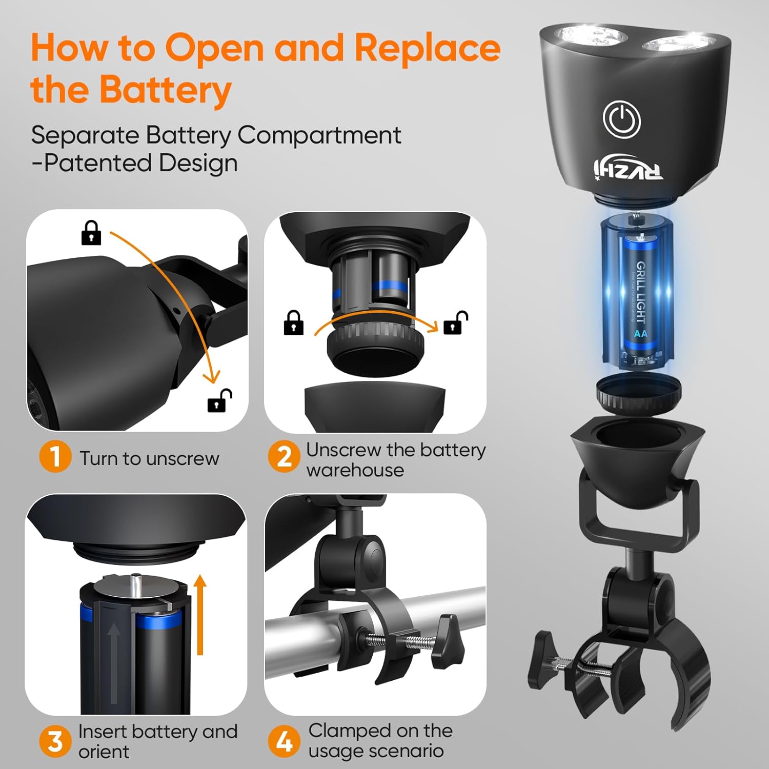 Durable Material for Long-Term Use: The RVZHI grill light is made of high-quality, tough nylon fiberglass for exceptional durability. Whether you’re grilling for a weekly barbecue or enjoying a holiday outdoor cooking, it’s built to withstand frequent use. The independently sealed, double-protected battery compartment opens simply by rotating it in the direction of the arrow on the grill light. Batteries can be quickly replaced without a screwdriver