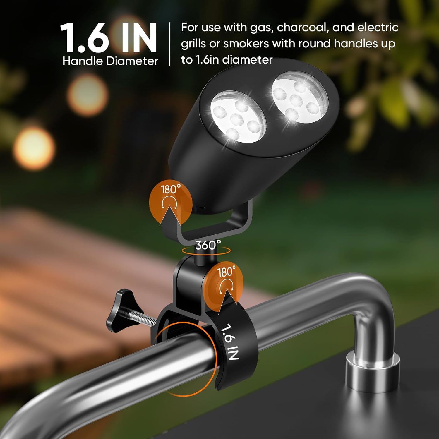 Max 1.6in C-clamp: Our grill light is a snap. Its adjustable C-clamps can be firmly attached to most round grill handles in seconds, without the need for any complex tools. This universal design makes it compatible with most types of grill equipment, including gas, charcoal, electric grills, and smokers. Whether a big BBQ party or a personal grilling session, the grill accessories will come in handy. Note: You need to measure the handle size of your grill to ensure it fits