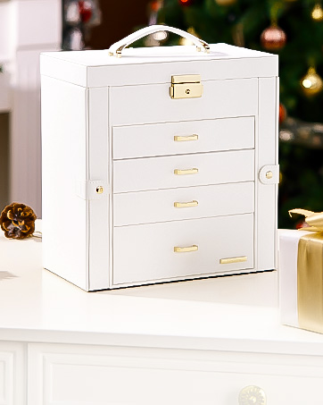 4 Pull Out Drawers, includes a deeper bottom drawer and 3 equal size drawers. Drawer 1 has 4 earring cards and a ring roll. Drawer 2 has 12 equal size compartments. Drawer 3 has 4 equal size compartments. The deeper bottom drawer has only one compartment to store large jewelries. Each drawer is equipped with a delicate handle which can be opened easily.
