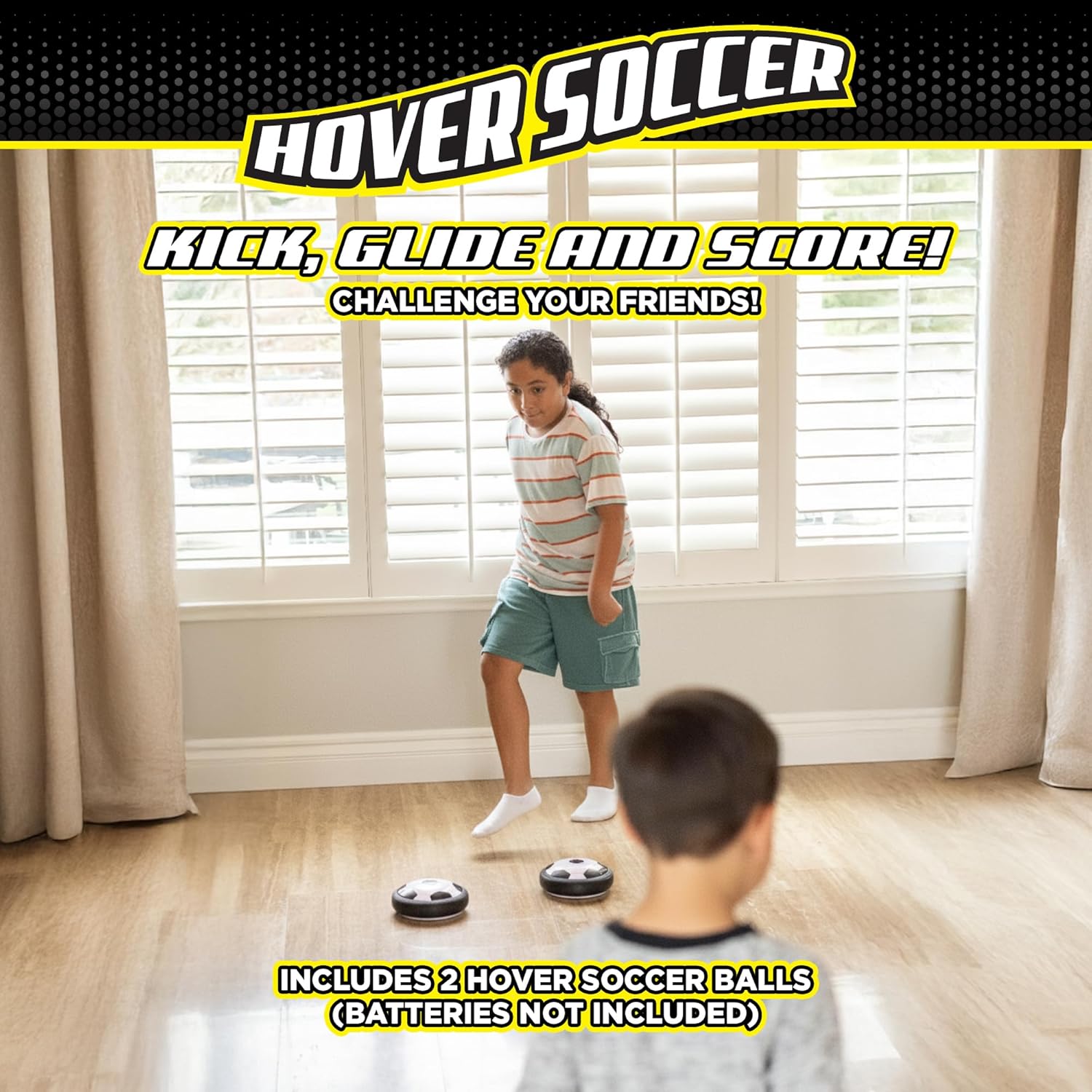 SOCCER MEETS AIR HOCKEY: Show off your footwork while experiencing the fast-paced thrill of air hockey with Stomp Sports Hover Soccer. Features revolutionary hover technology that glides effortlessly on smooth indoor surfaces such as wood, tile, & vinyl. The foam padded edges help protect your furniture from damage. Includes 2 Hover Soccer toys. Requires 4 AA batteries each (not included).