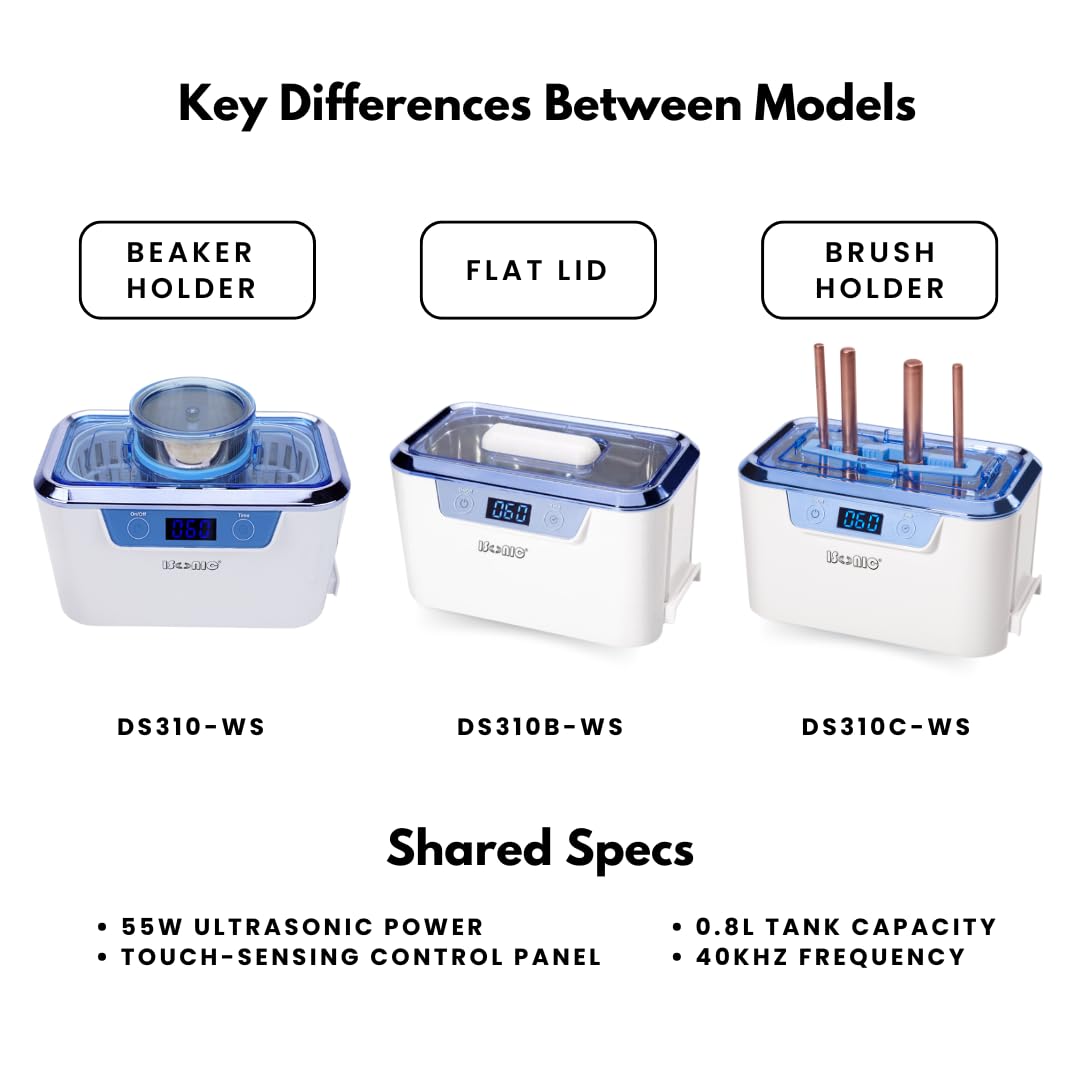 DS310 is a miniaturized commercial model with a powerful 50W stack transducer with much higher power intensity than most ultrasonic cleaners. 110V 55W, 40, 000Hz. It is the smallest commercial grade ultrasonic cleaner with a stack transducer in the world. It has many good features: a convenient power switch, a detachable power cord, a cooling fan built in, touch-sensing controls. Black plus rose gold color scheme is very attractive for jewelry and optical stores, and homes. Multiple configurations are available: 1. DS310 (black) with an integrated beaker holder, a 250 ml (1/2 pint) stainless steel beaker, a strainer attached to the beaker cover. Small items such as jewelry, dentures, aligners, retainers can cleaned in the stainless steel beaker. Larger items such as eyeglasses and sunglasses, airbrushes etc. can be cleaned in the main tank. 2. DS310B (black) for with a regular lid. It can be used to clean jewelry, eyeglasses, sunglasses, airbrushes in the main tank. 3. DS310C (black) with a makeup brush holder to clean makeup brushes in the main cleaning tank. It can also be used to clean jewelry, eyeglasses, sunglasses, airbrushes etc. in the main tank. Using a beaker to clean and to change water makes it much easier to handle compared to do it in the main cleaning tank of the ultrasonic cleaner. The unit size is as small as a personal model but it has commercial model’s power and features. These are the key advantages of this model.
