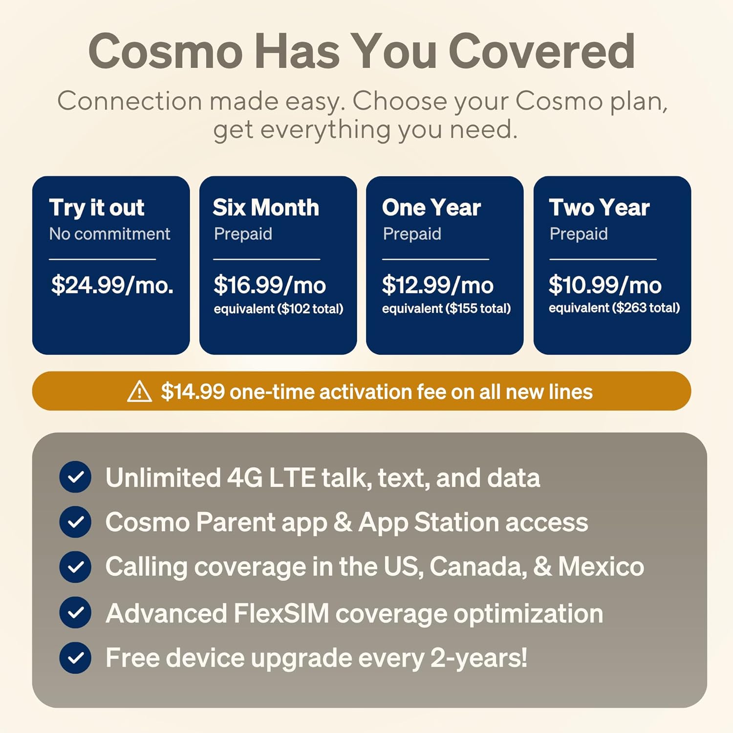 SECURE CALLING & MESSAGING –– Get the best kid-safe connection with Cosmo. Reliable family-safe calling coverage across the US, Canada, and Mexico. With Cosmo’s True Texting, securely share text, pictures, audio, and even short video messages with parent-approved contacts to bring everyone closer together.