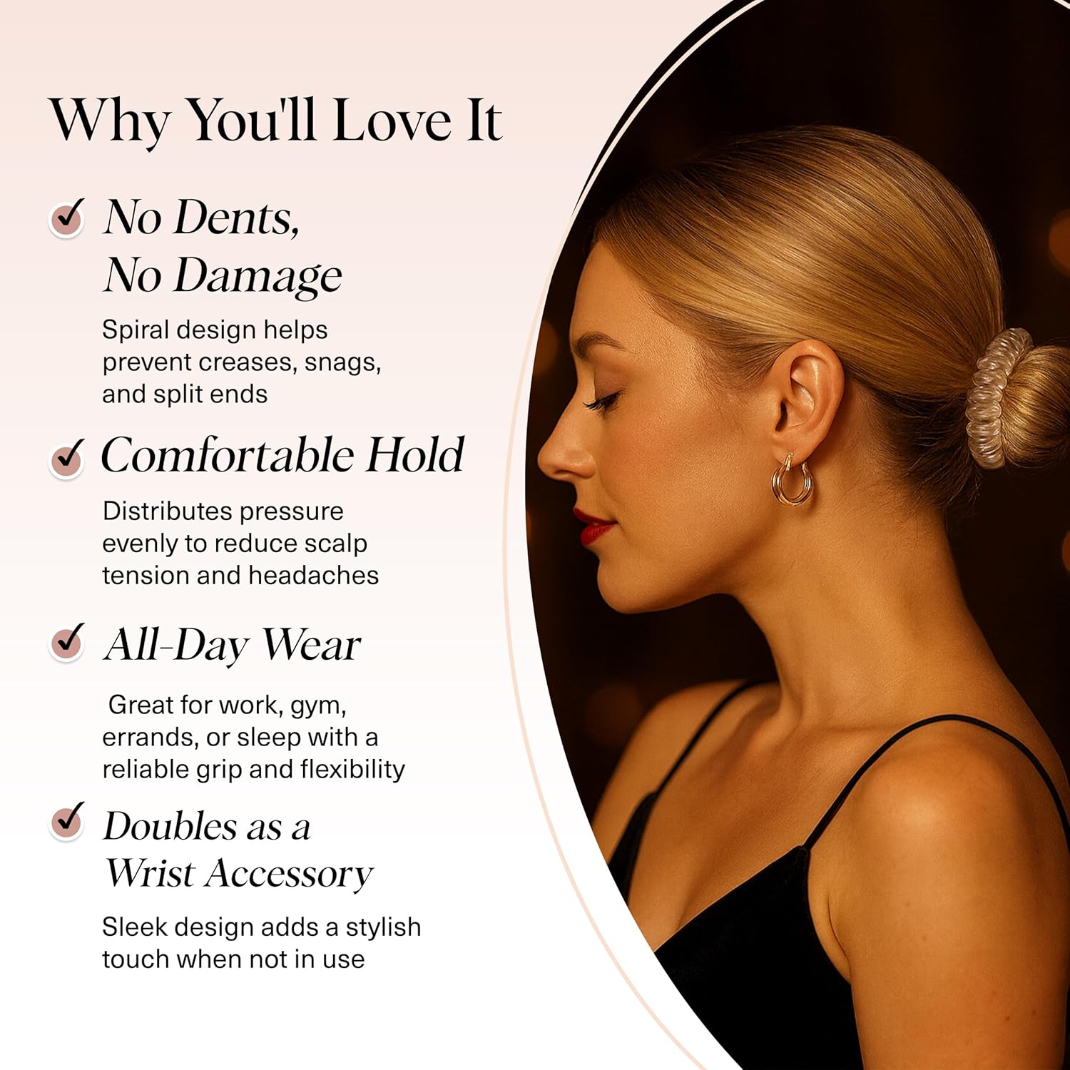 NO BUMPS OR HAIR HEADACHES: Designed for comfort, these spiral hair ties for women distribute pressure evenly across the scalp to prevent tight ponytail-induced headaches. The spiral design helps reduce tension on your roots, eliminating unwanted creases and bumps—making them ideal for all-day wear and perfect for work, workouts, school, or evening events.