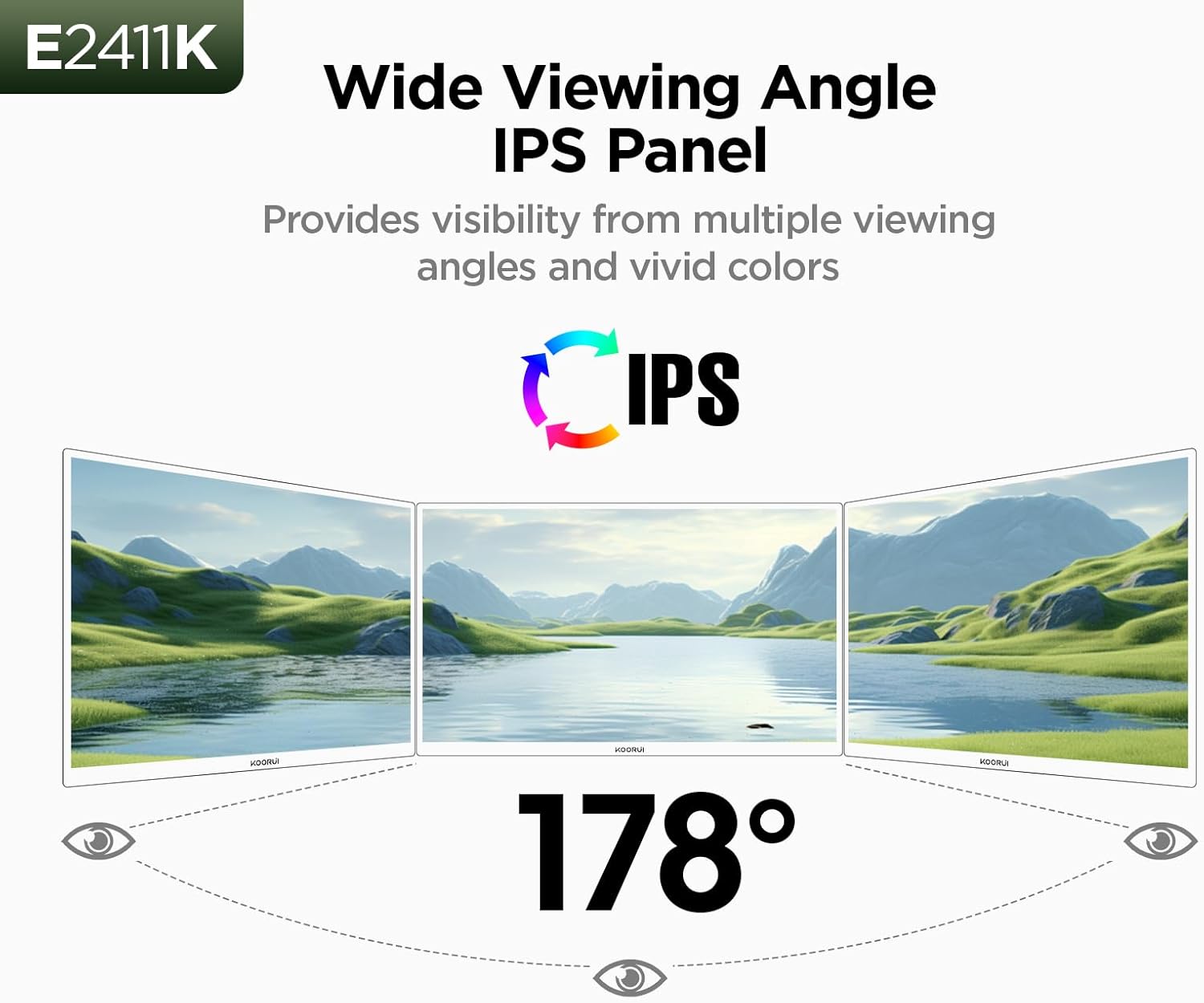 Vibrant color accuracy: Enjoy stunning visuals with this 24-inch KOORUI monitor, featuring an IPS panel, 99% sRGB, and 72% NTSC color coverage. Wide viewing angles and accurate color reproduction make it ideal for gaming, content creation, and media consumption.