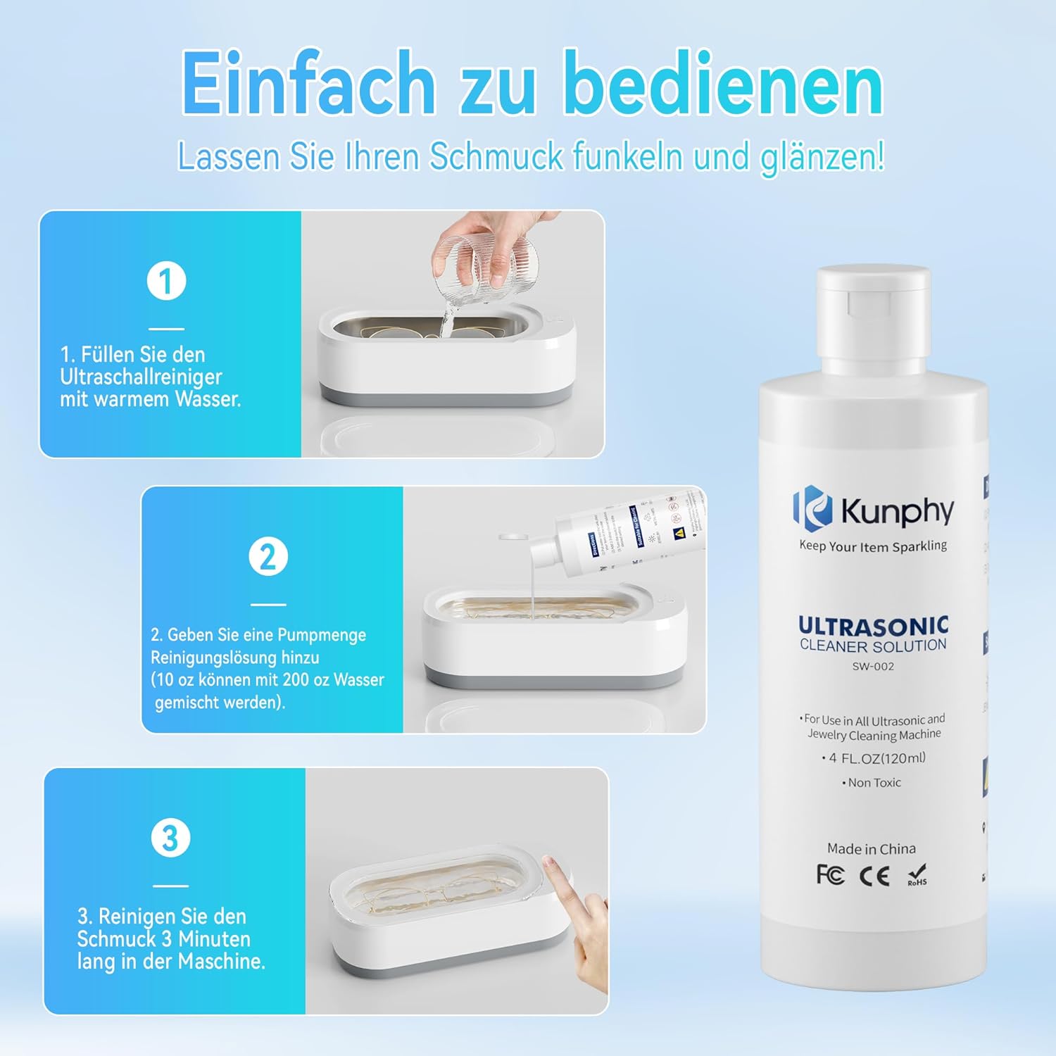 kunphy Jewelry Cleaner Solution -Ultrasonic Cleaner Solution for Gold, Silver, Platinum Diamonds and Non-Porous Precious & Semi-Precious Jewelry 4 oz(120ml)