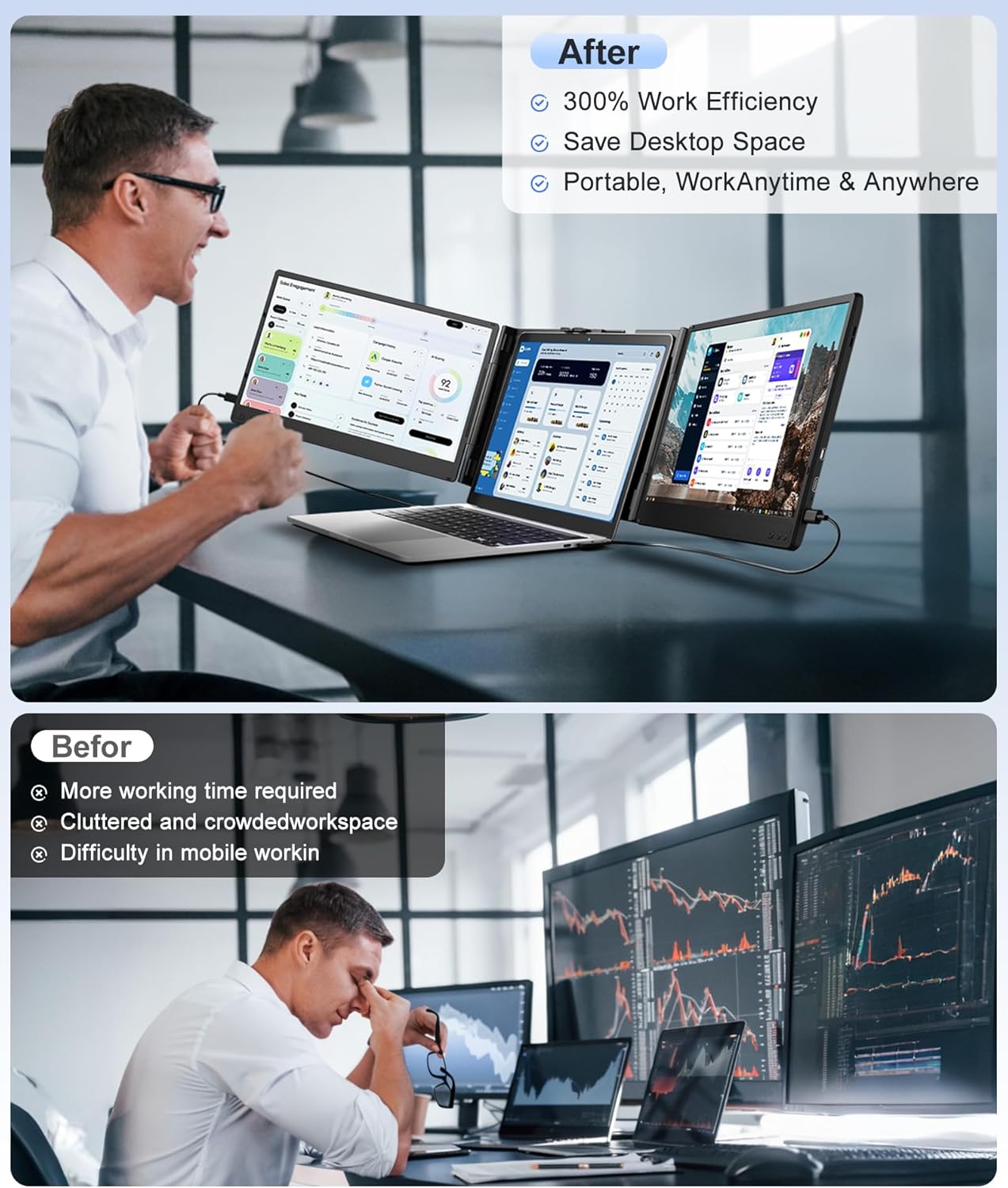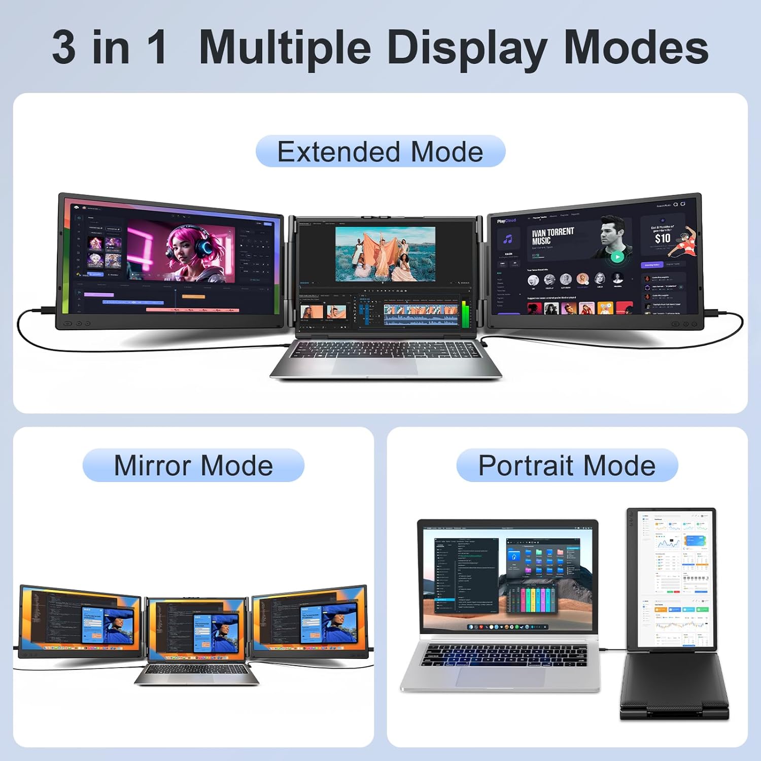 【Triple Screen Setup for 300% Efficiency】Instantly transform your laptop into a powerful triple-screen workstation with two additional displays. No more constant switching between tabs or windows—everything is visible at a glance, boosting productivity by up to 300%. The laptop monitor extender supports extended and mirrored display modes, you can easily adapt to multitasking needs, from spreadsheets and design tools to meetings and entertainment. Ideal for professionals, students, gamers, programmers, traders, designers, and business travelers, this portable laptop monitor is also a thoughtful gift choice for anyone who values efficiency and convenience in work or study.