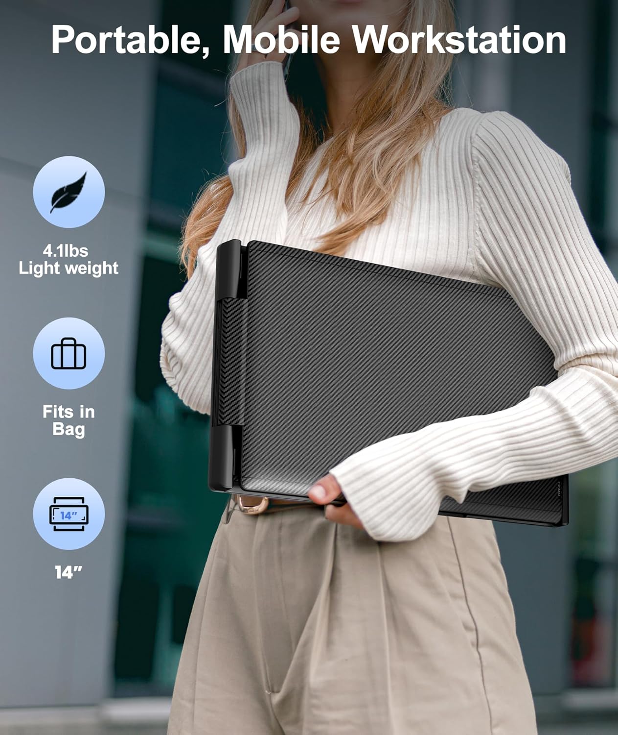 【Upgraded Functional Design】Compared to the previous 14-inch triple monitor extender, our new design is even lighter (the device weighs 4.1 pounds), making it easier to carry for business travel or mobile office needs. The T2Pro laptop screen extender’s upgraded one button auto-stretch back panel allows effortless width adjustment, fitting laptops from 13″ to 17″. A reinforced top hook securely fastens the screen extender onto your laptop, preventing slipping during use. Meanwhile, the reinforced widened back stand provides stable desktop support, and its adjustable length easily adapts to different screen heights and angles for maximum convenience.