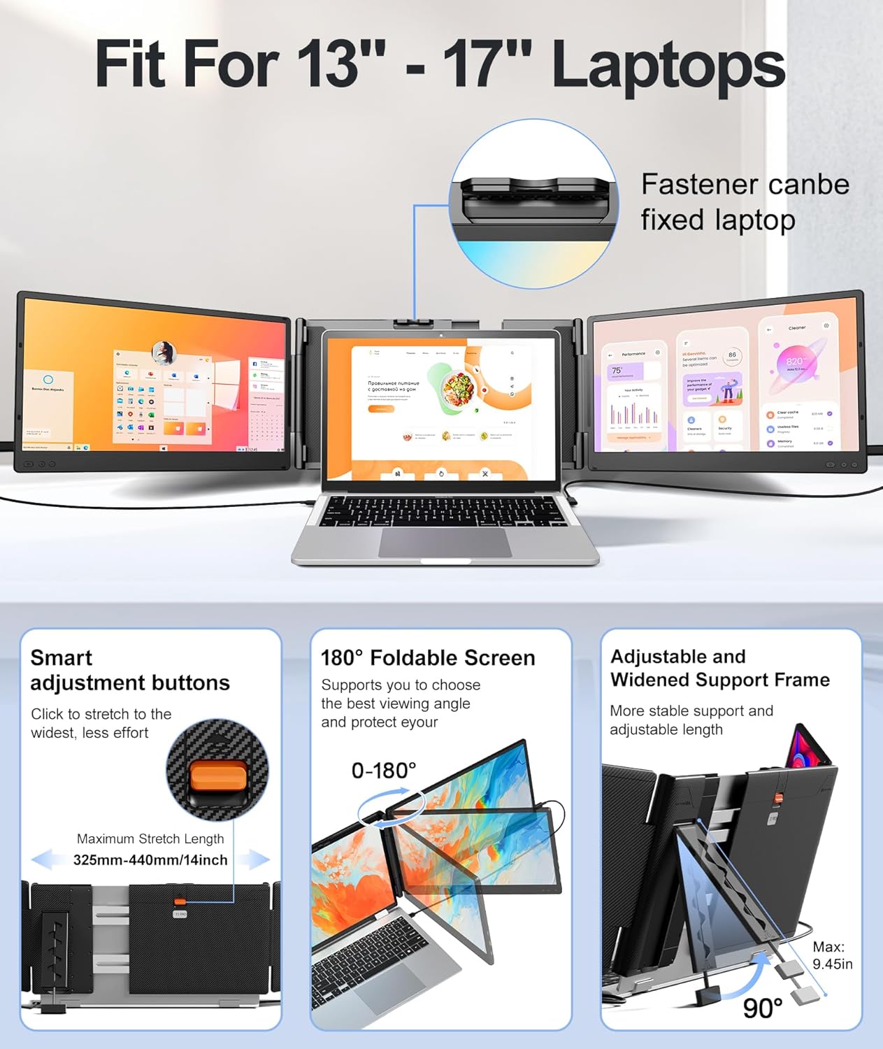Laptop Screen Extender, 14″ FHD 1080P Portable Monitor for Laptop, Plug&Play Triple Screen Extender, Auto Adjust Width Dual Monitor for 13″ – 17″ Laptops, Compatible with MacOS/Wins/Chrome/Dex