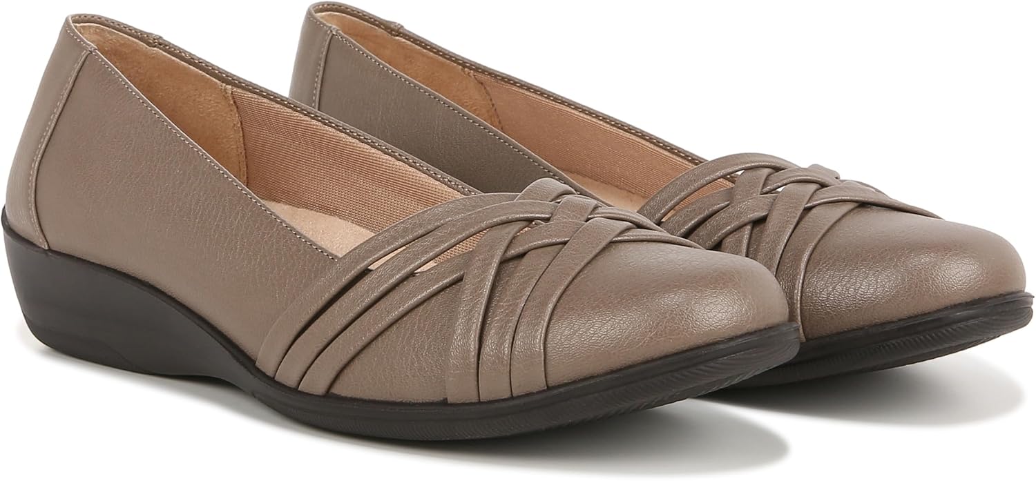 Go everywhere life takes you this season in a stylish flat with cute crisscross straps over a rounded toe. Faux leather with a round toe, slip-on fit, lightweight and flexible design, and overlapping strap design. Toe box, heel counter, and linings partially crafted with recycled materials. Soft System® comfort package provides all-day support, flex, and cushioning. Get next-level comfort with Velocity 2.0®, featuring luxe linings, superior cushioning, and a premium insole with shock absorption & pressure distribution. Traction sole provides you with extra stability. Just Right Height 1.75 inch wedge heel.