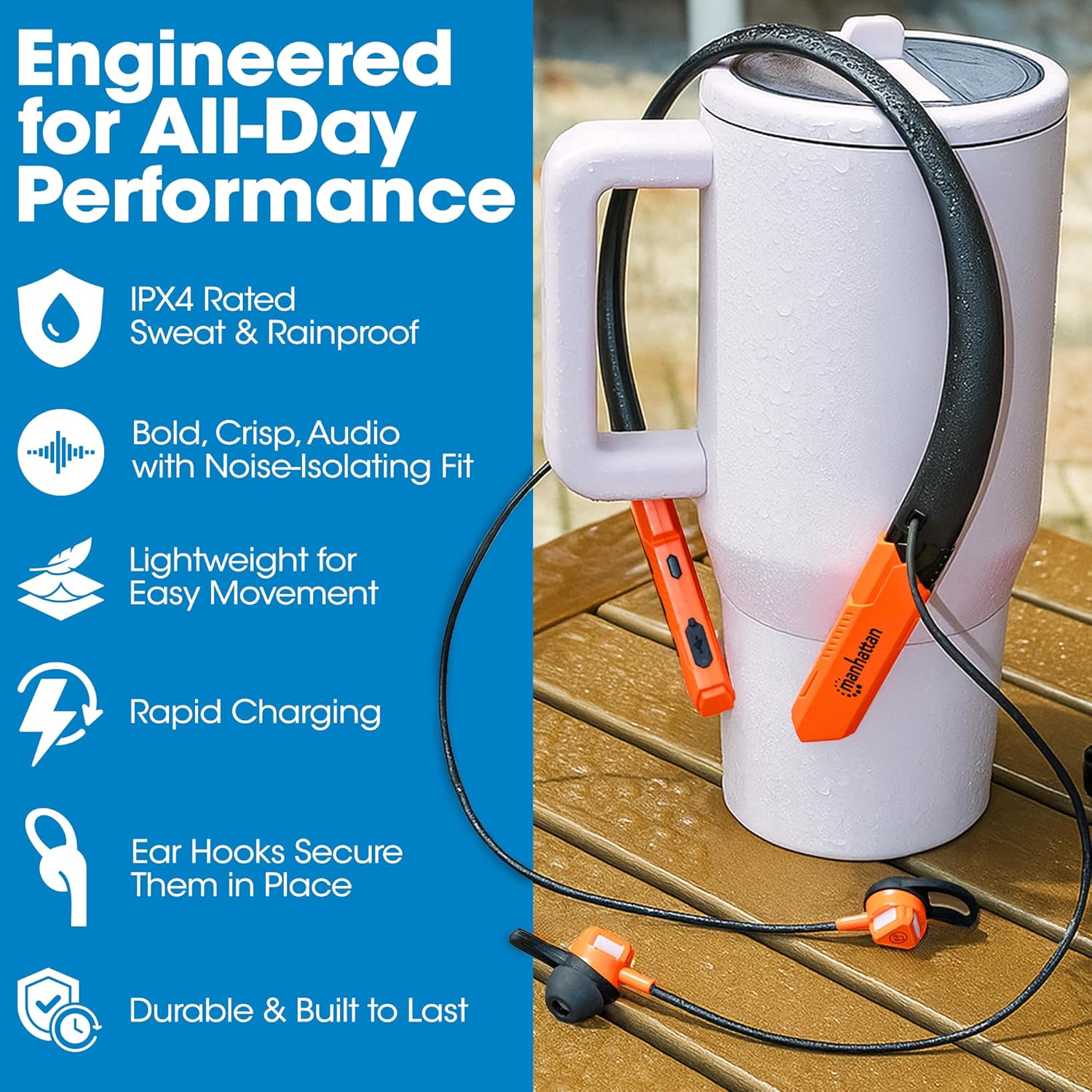 MANHATTAN Bluetooth Wireless Neckband Headphones — Work Earbud Earphones with 15H Playtime, Noise-Isolating, IPX4 Water Resistant, Built-in Mic – for Work, Music, Calls – 3 Yr Mfg Warranty -179829