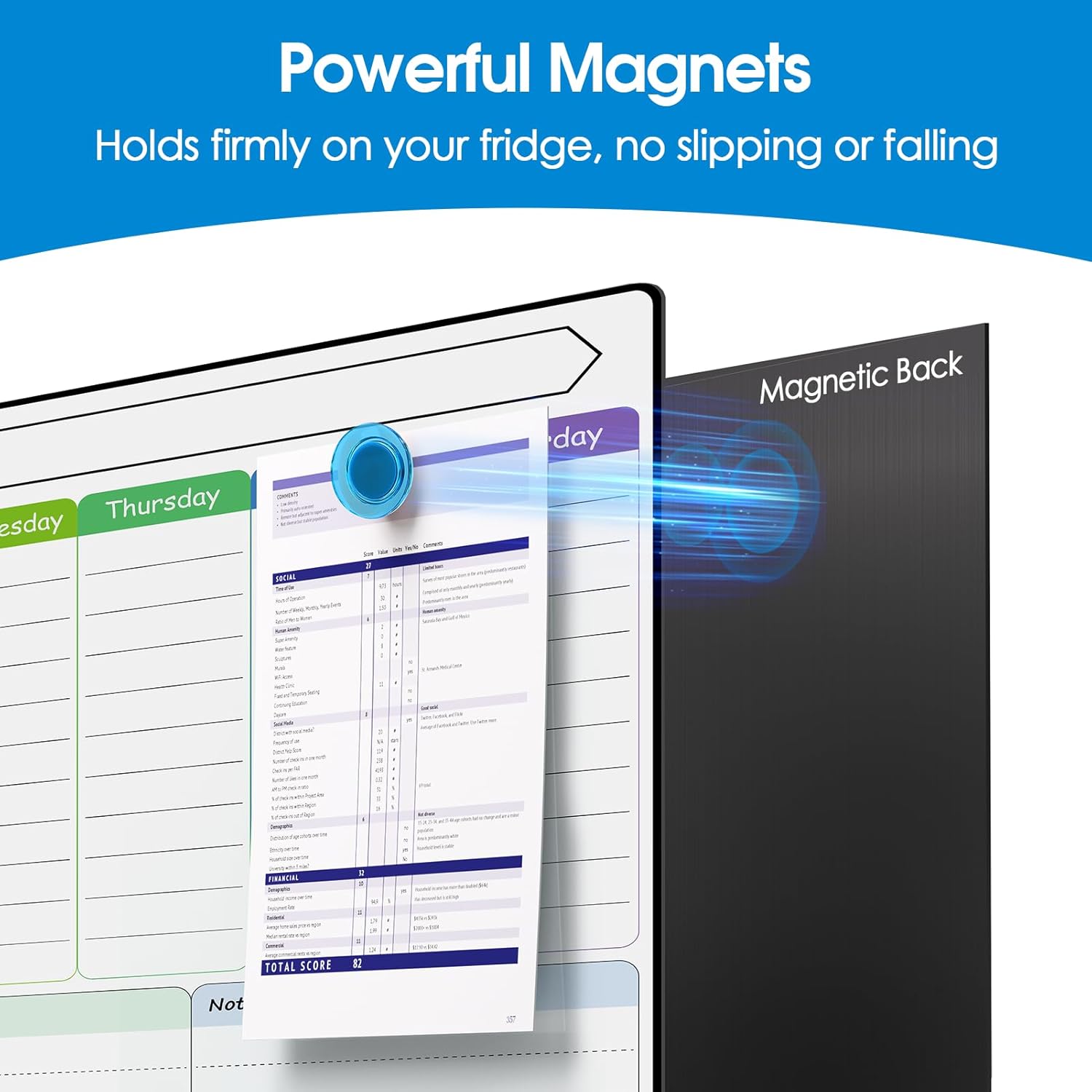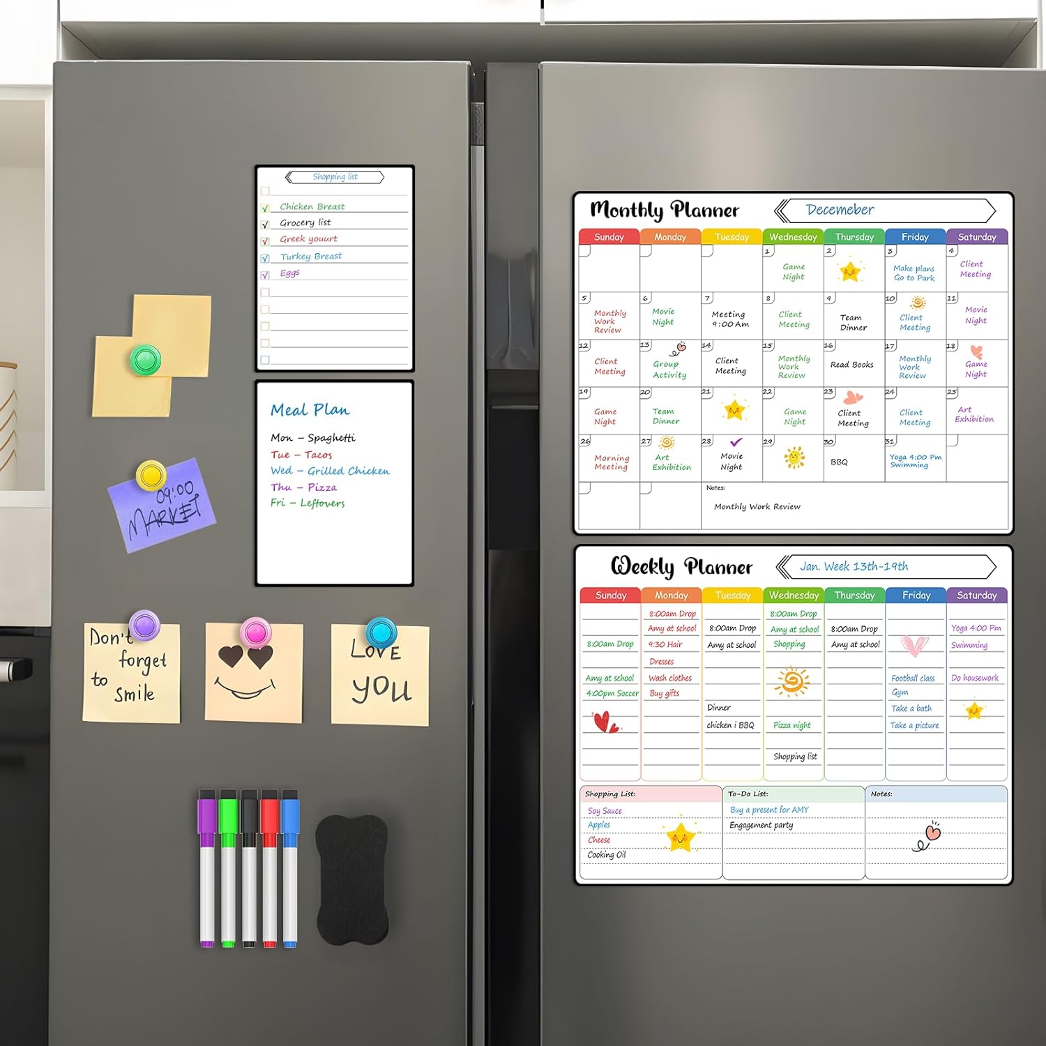 Complete Set with Magnetic Accessories:Includes four fridge dry erase calendar board: Monthly Calendar, Weekly Planner, Shopping List, and Notes Board, plus 5 colorful dry erase markers (with built-in erasers), 1 magnetic eraser, and 5 strong magnets. All components can be attached to magnetic surfaces for easy access and organization