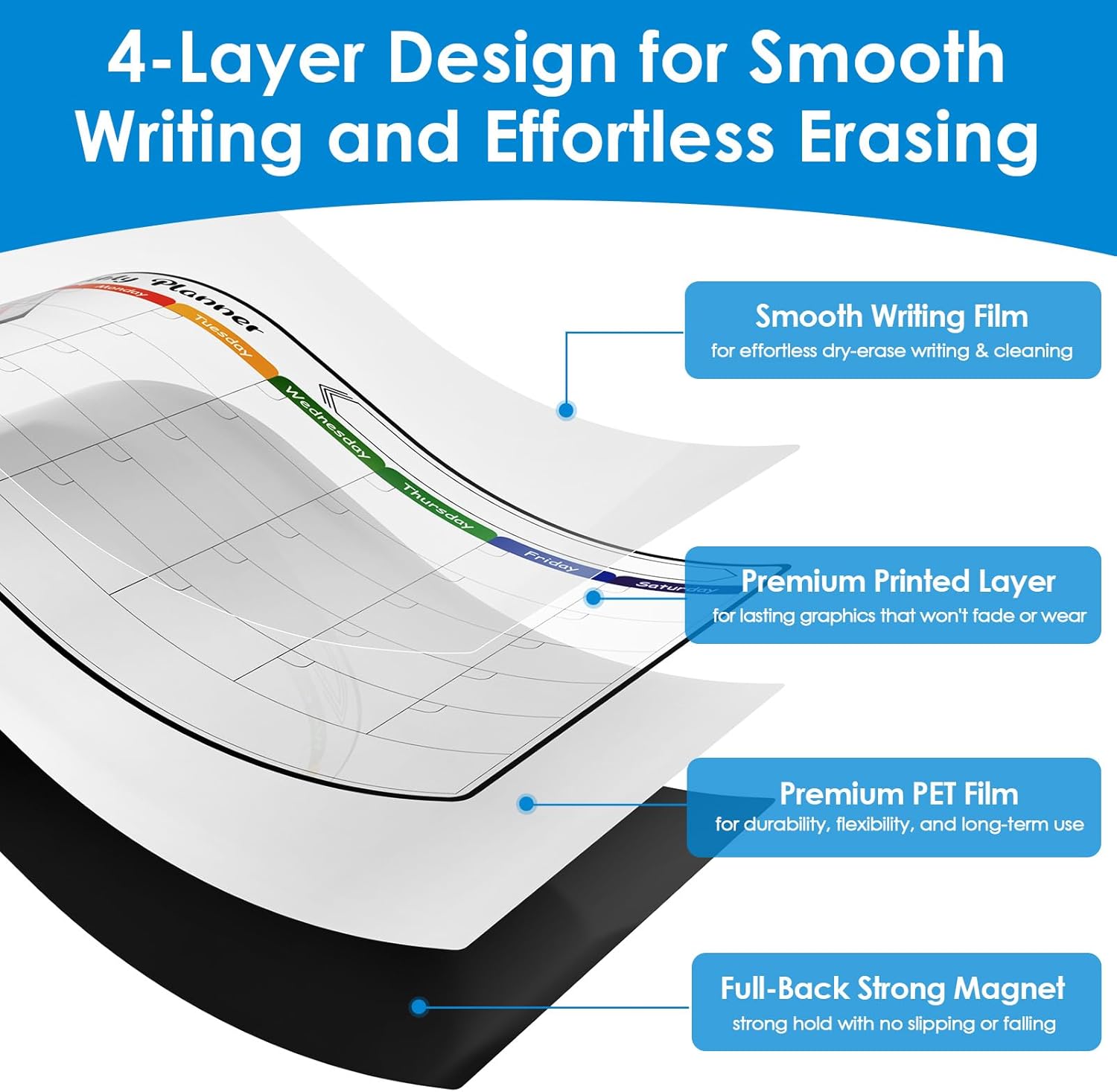 Smooth Writing and Effortless Erasing: Our magnetic whiteboard calendar features a stain-resistant surface for smooth writing and easy cleaning—no smudges or ghosting. Reusable and long-lasting, it wipes completely clean like new after every use, making planning simple and sustainable