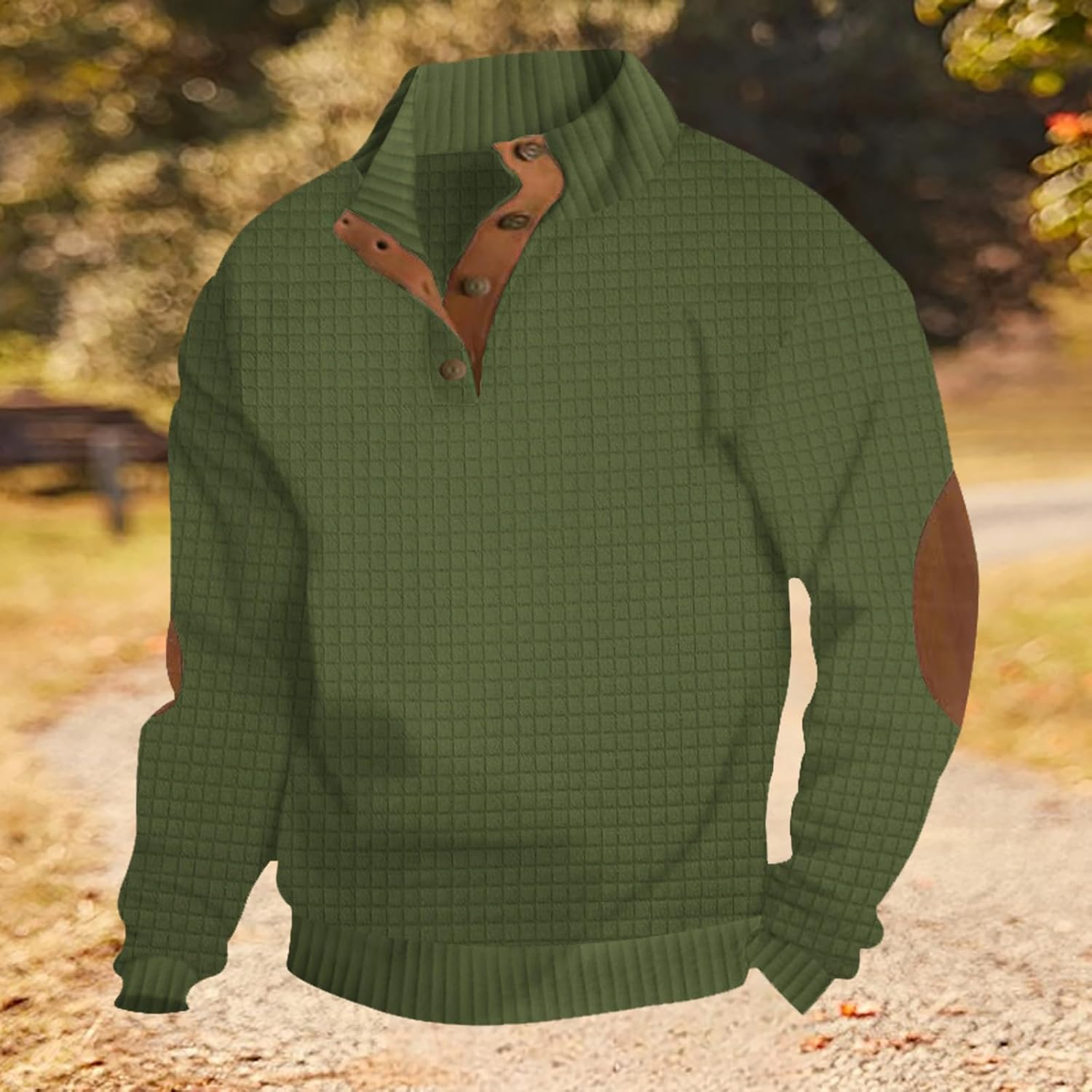 Men’s Waffle Knit Long Sleeve Sweatshirt Classic Stand Collar Quarter Button Up Pullover Elbow Patches Sweatshirts