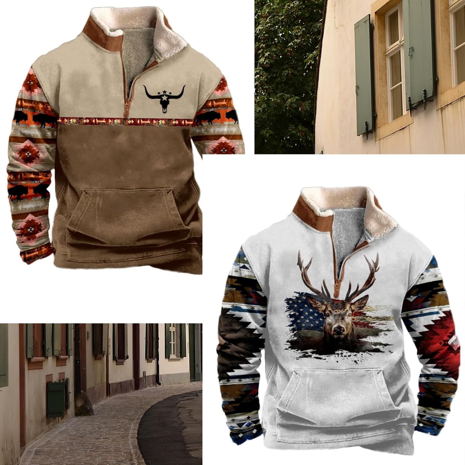 Men’s Western Fleece Sweatshirts Aztec Cowboy Vintage Cow Skull Print Jacket Long Sleeve Retro Quarter Zip Pullover