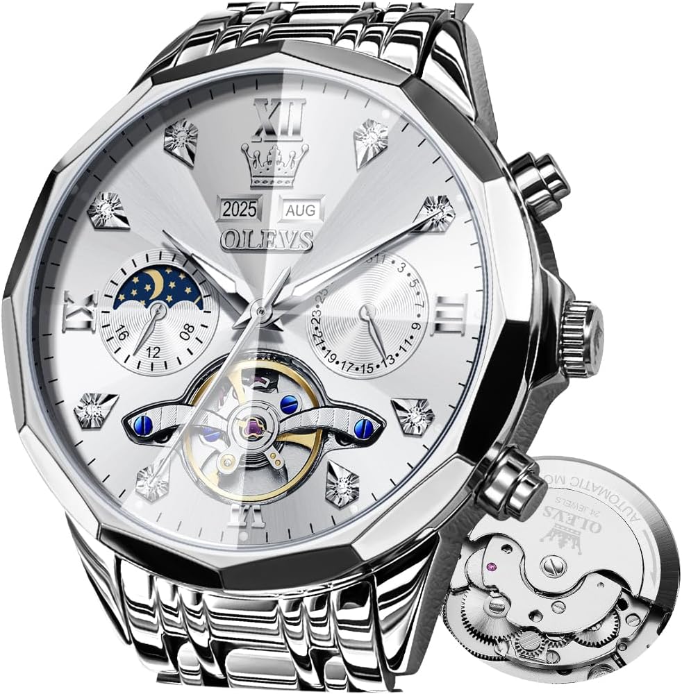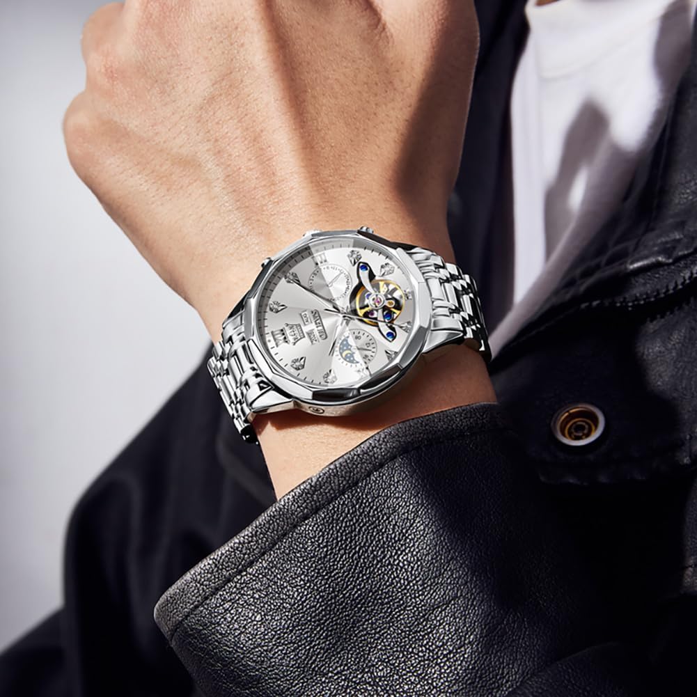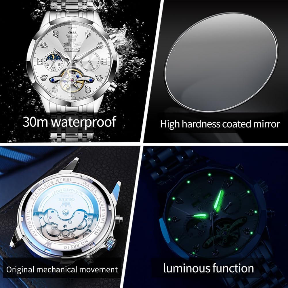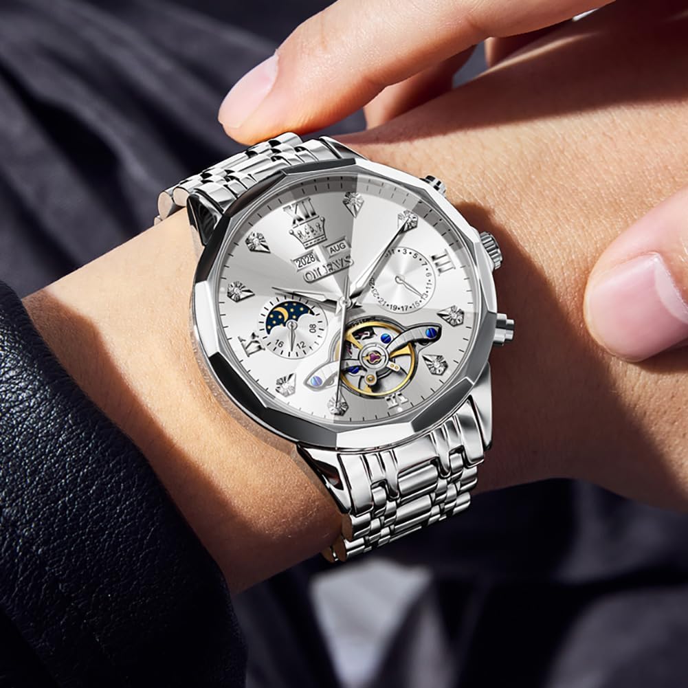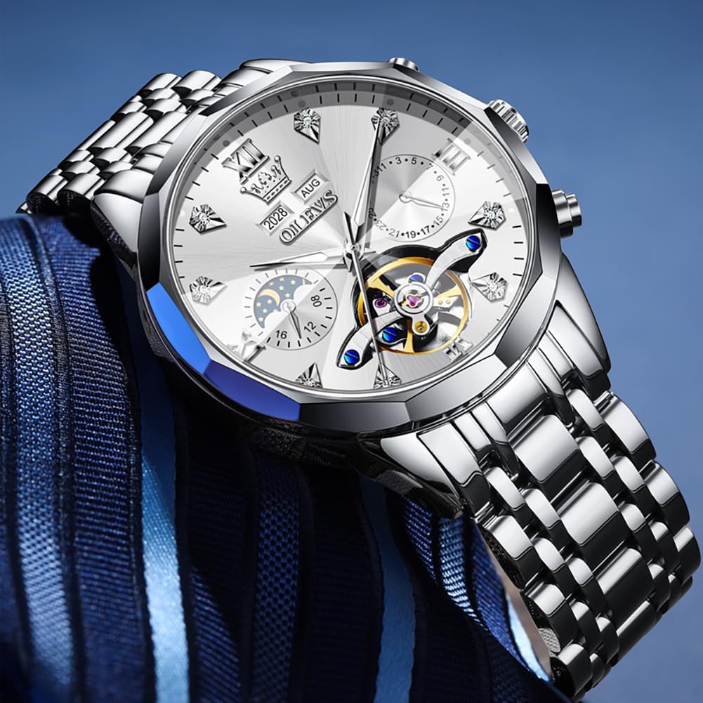 OLEVS Automatic Watch for Men Luxury Diamond Self Winding Multifunctional Men’s Calendar Watch Stainless Steel Waterproof Luminous Male Watch