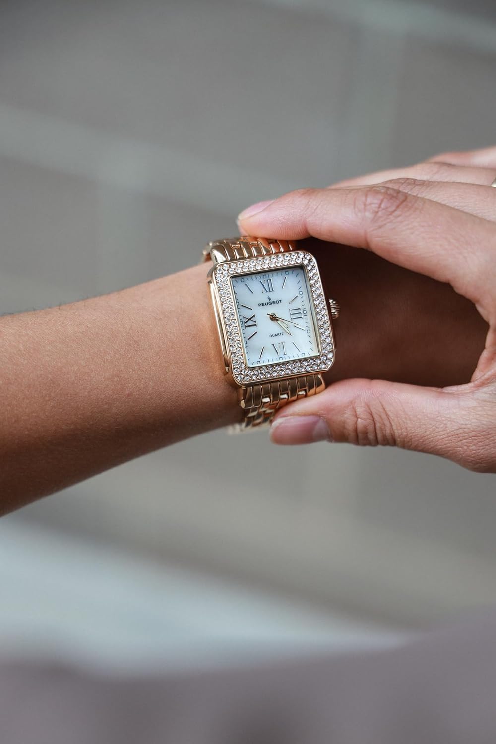 Be the first to review “Peugeot Women Rectangle Dress Watch with Crystal Decorated Bezel, Roman Numerals and Bracelet”