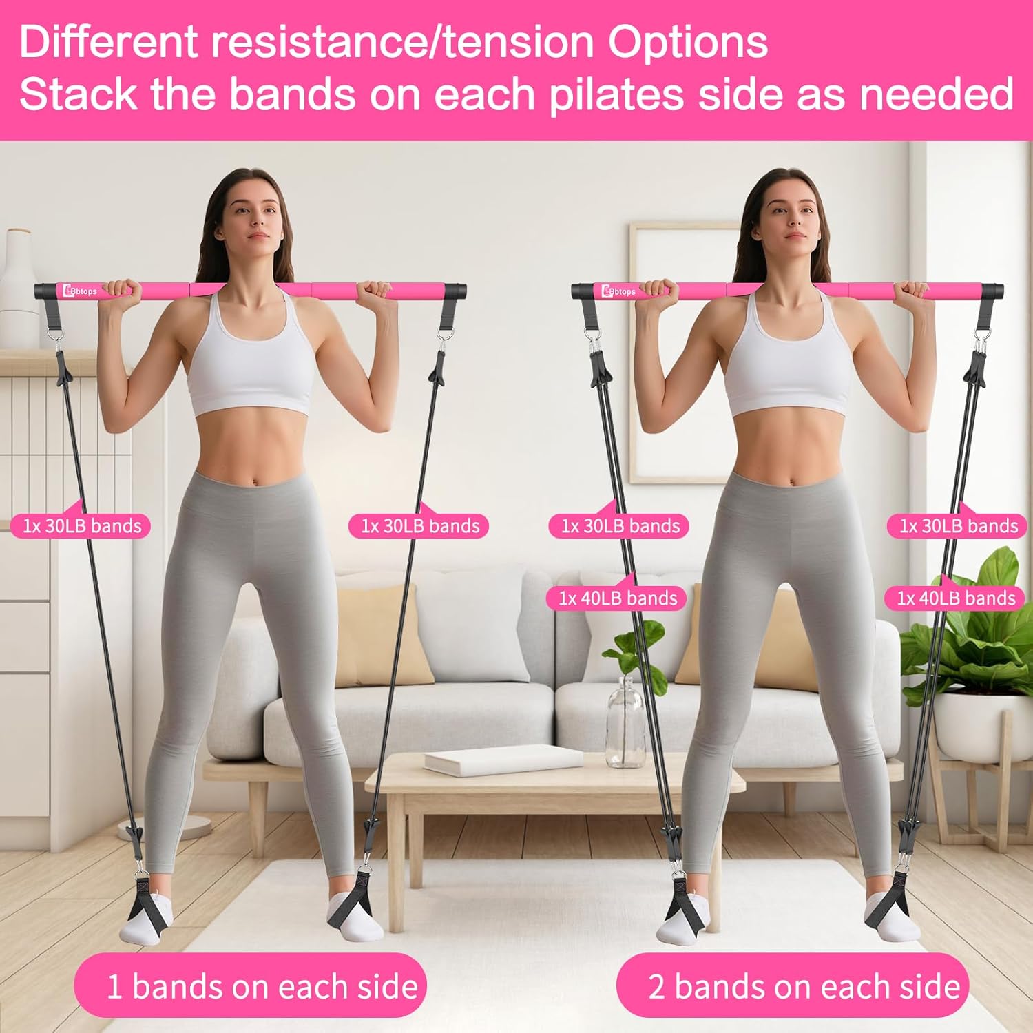 【Bbtops Pilates Bar】- The connecting point where the ends of bands is attached to carabiner by the Nylon fabric,not the bands connecting carabiners directly,which quite different from that of others,providing absolutely much stronger durability when training.Resistance bands Carrying it conveniently to your home,office,gym or some outdoor occasion,perfect for workout fitness,like Yoga,Pilates,band resistance exercising and other training purpose