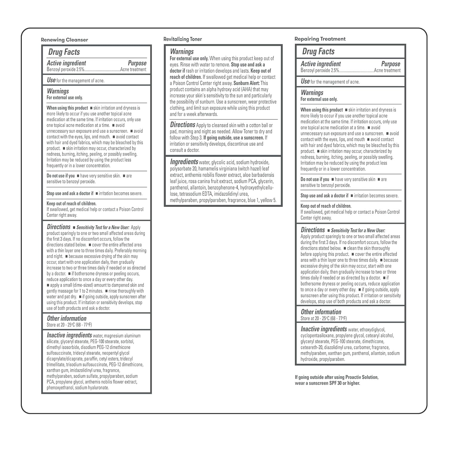 This kit includes: Proactiv Solution Renewing Cleanser, 2 FL. OZ. ; Proactiv Solution Revitalizing Toner, 2 FL. OZ. ; Proactiv Solution Repairing Treatment, 1 FL. OZ.